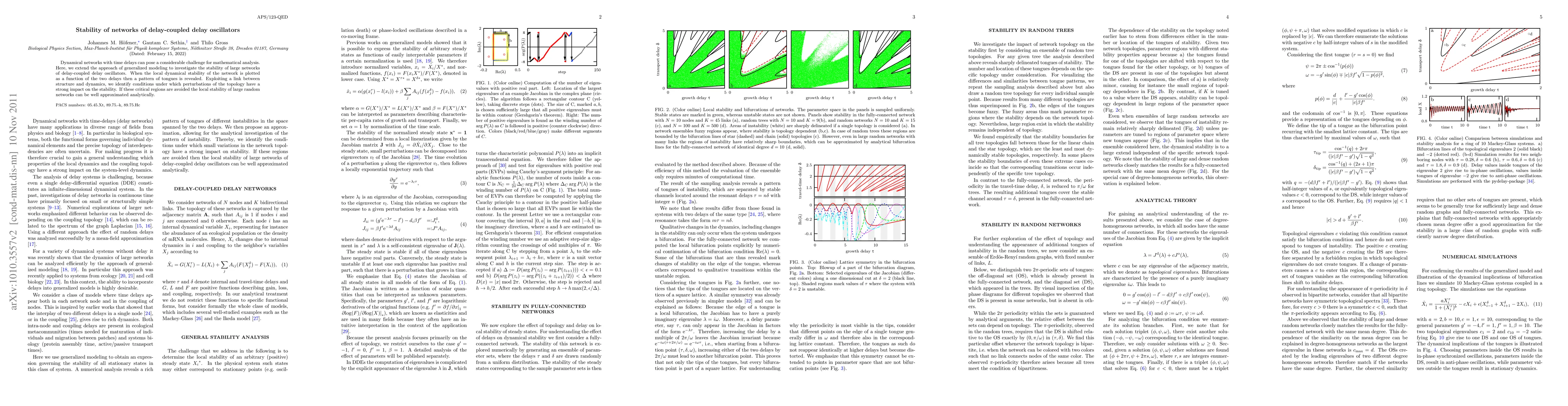 Dynamical networks with time delays can pose a considerable challenge for mathematical analysis. Here, we extend the approach of generalized modeling to investigate the stability of large networks of delay-coupled delay oscillators. When the local dynamical stability of the network is plotted as a function of the two delays then a pattern of tongues is revealed. Exploiting a link between structure and dynamics, we identify conditions under which perturbations of the topology have a strong impact on the stability. If these critical regions are avoided the local stability of large random networks can be well approximated analytically.