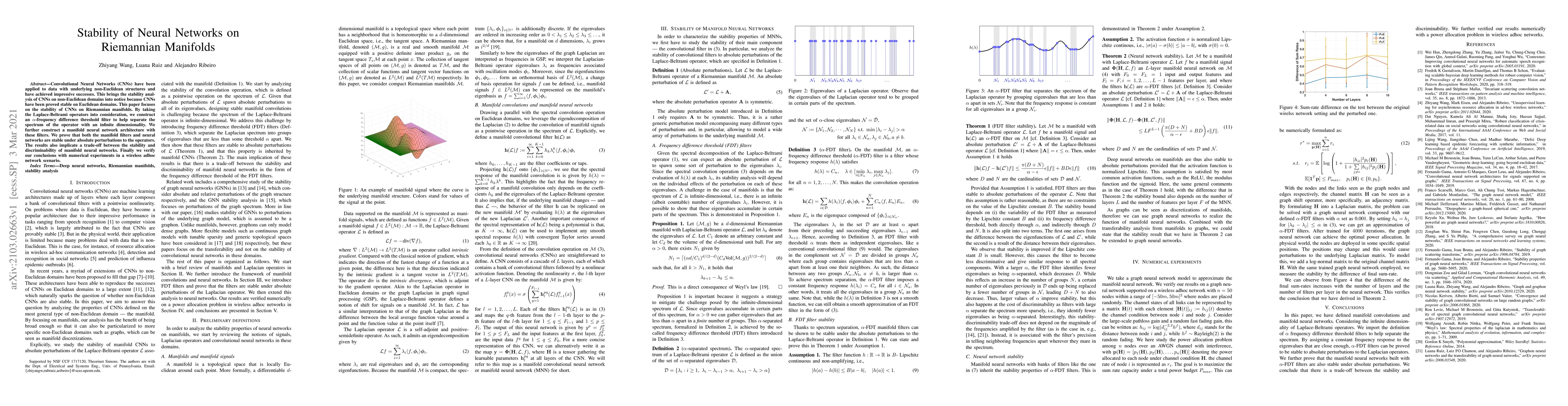 This paper investigates the stability of Convolutional Neural Networks (CNNs) on Riemannian manifolds using Laplace-Beltrami operators. It introduces an $\alpha$-frequency difference threshold filter and demonstrates the stability of the manifold filters and neural network architectures under perturbations, concluding with a trade-off between stability and discriminability validated via experiments in a wireless adhoc network.