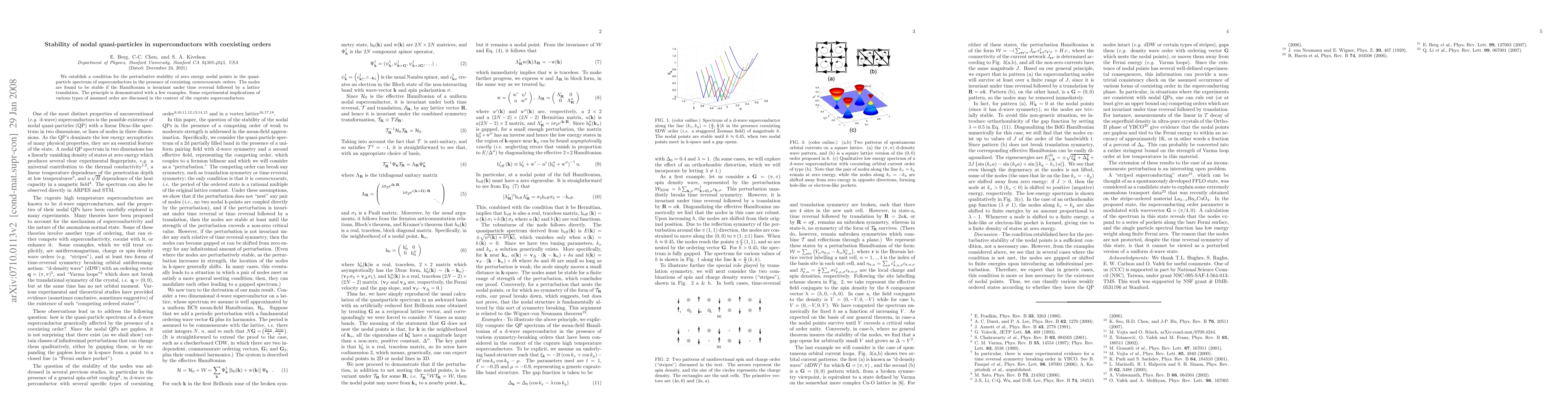 We establish a condition for the perturbative stability of zero energy nodal points in the quasi-particle spectrum of superconductors in the presence of coexisting \textit{commensurate} orders. The nodes are found to be stable if the Hamiltonian is invariant under time reversal followed by a lattice translation. The principle is demonstrated with a few examples. Some experimental implications of various types of assumed order are discussed in the context of the cuprate superconductors.