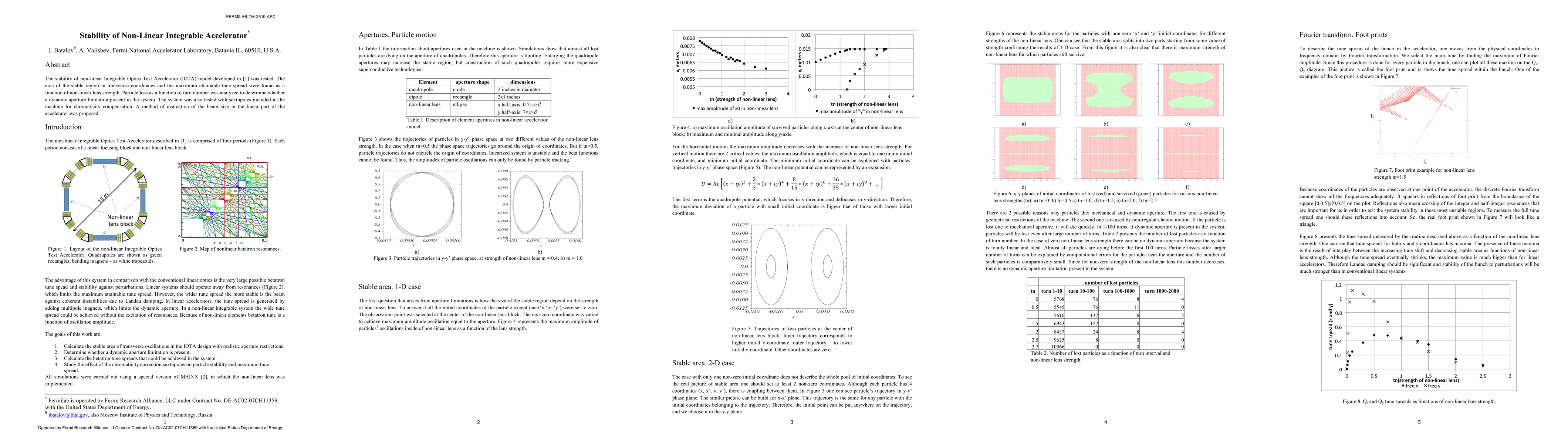 The stability of non-linear Integrable Optics Test Accelerator (IOTA) model was tested. The area of the stable region in transverse coordinates and the maximum attainable tune spread were found as a function of non-linear lens strength. Particle loss as a function of turn number was analyzed to determine whether a dynamic aperture limitation present in the system. The system was also tested with sextupoles included in the machine for chromaticity compensation. A method of evaluation of the beam size in the linear part of the accelerator was proposed.