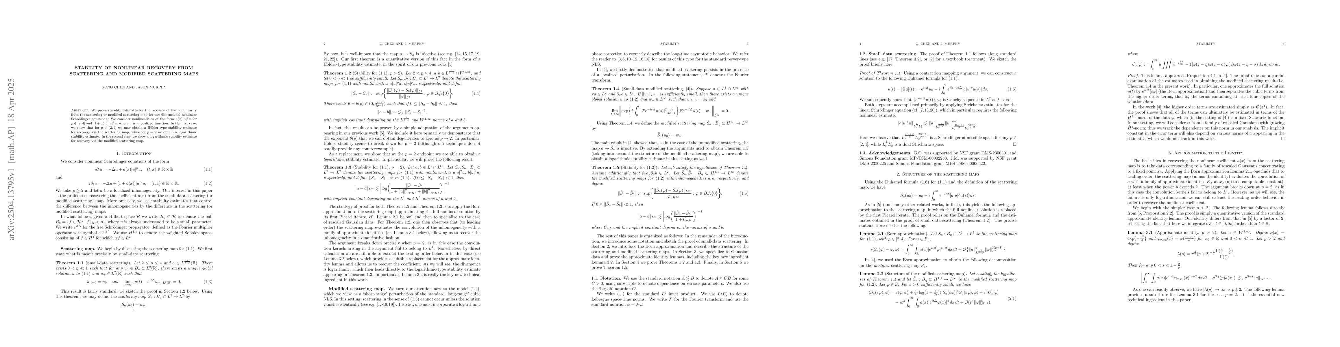 The paper proves stability estimates for recovering nonlinearity from scattering and modified scattering maps in one-dimensional nonlinear Schrödinger equations.