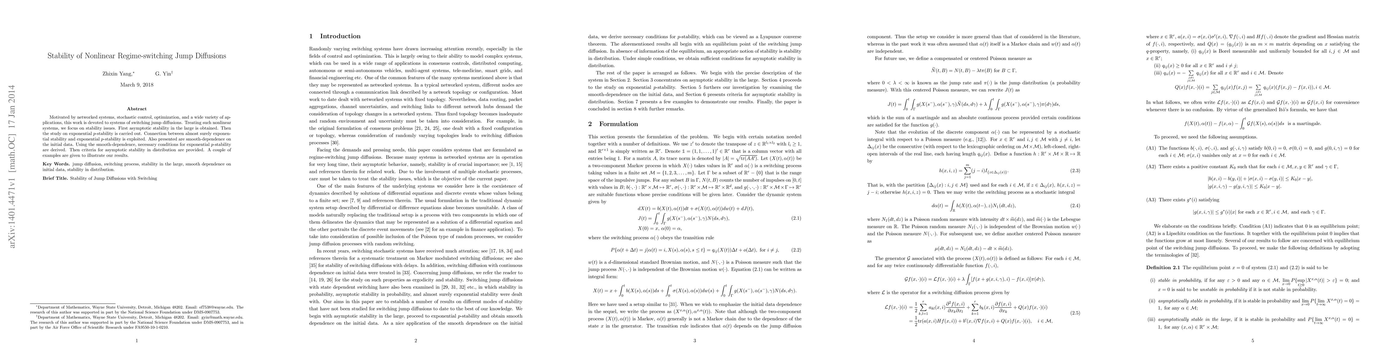 Motivated by networked systems, stochastic control, optimization, and a wide variety of applications, this work is devoted to systems of switching jump diffusions. Treating such nonlinear systems, we focus on stability issues. First asymptotic stability in the large is obtained. Then the study on exponential p-stability is carried out. Connection between almost surely exponential stability and exponential p-stability is exploited. Also presented are smooth-dependence on the initial data. Using the smooth-dependence, necessary conditions for exponential p-stability are derived. Then criteria for asymptotic stability in distribution are provided. A couple of examples are given to illustrate our results.