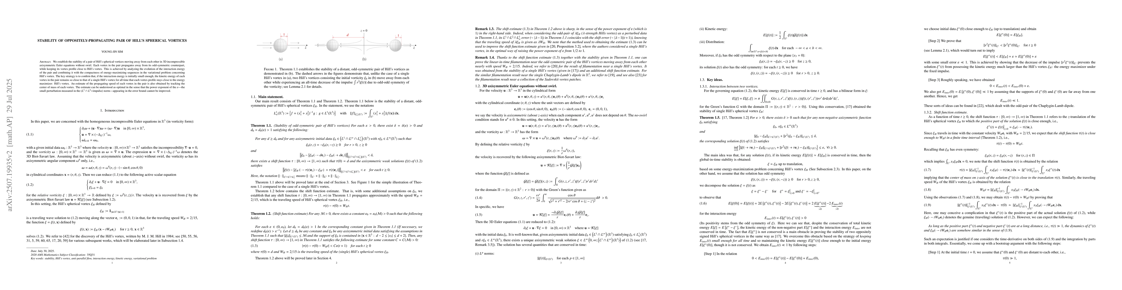 This research proves the stability of two Hill's spherical vortices moving apart in 3D incompressible flow without swirl. It combines interaction energy analysis with variational problem solutions to show each vortex maintains its Hill's profile, and estimates their propagating speeds, which are deemed optimal.