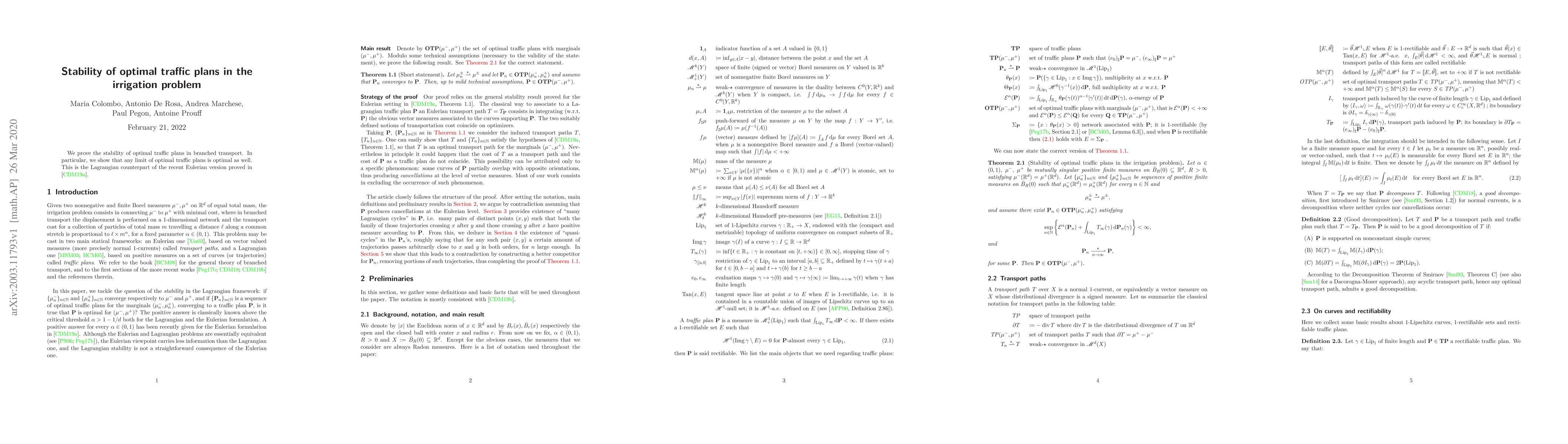 This paper proves the stability of optimal traffic plans in branched transport networks, demonstrating that any limit of optimal traffic plans remains optimal, mirroring the recent Eulerian stability proof from [CDM19a].
