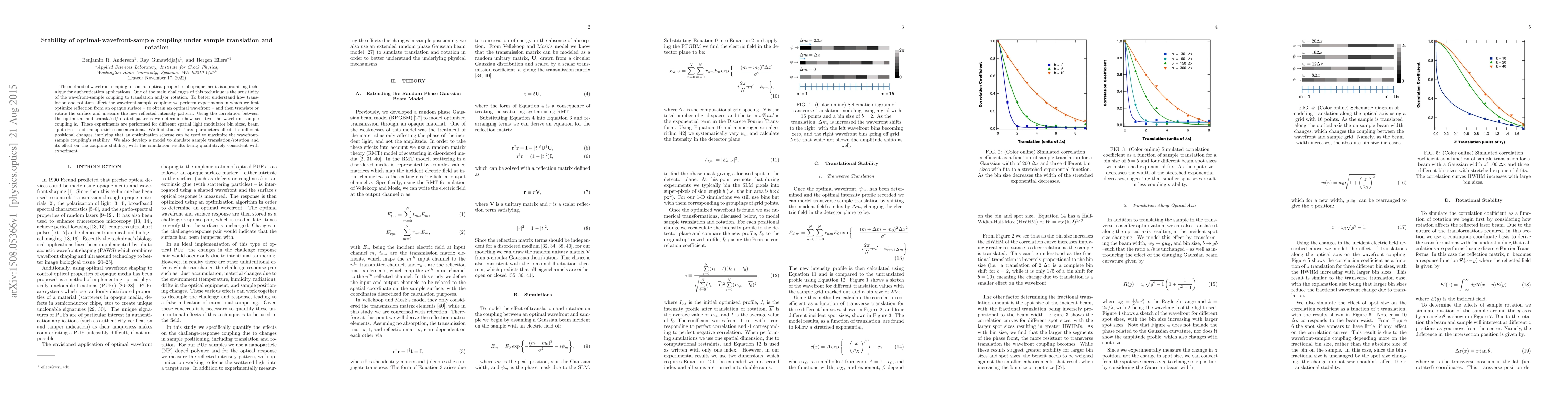 The method of wavefront shaping to control optical properties of opaque media is a promising technique for authentication applications. One of the main challenges of this technique is the sensitivity of the wavefront-sample coupling to translation and/or rotation. To better understand how translation and rotation affect the wavefront- sample coupling we perform experiments in which we first optimize reflection from an opaque surface--to obtain an optimal wavefront--and then translate or rotate the surface and measure the new reflected intensity pattern. By using the correlation between the optimized and translated or rotated patterns we determine how sensitive the wavefront-sample coupling is. These experiments are performed for different spatial-light-modulator (SLM) bin sizes, beam-spot sizes, and nanoparticle concentrations. We find that all three parameters affect the different positional changes, implying that an optimization scheme can be used to maximize the stability of the wavefront-sample coupling. We also develop a model to simulate sample translation or rotation and its effect on the coupling stability, with the simulation results being qualitatively consistent with experiment.