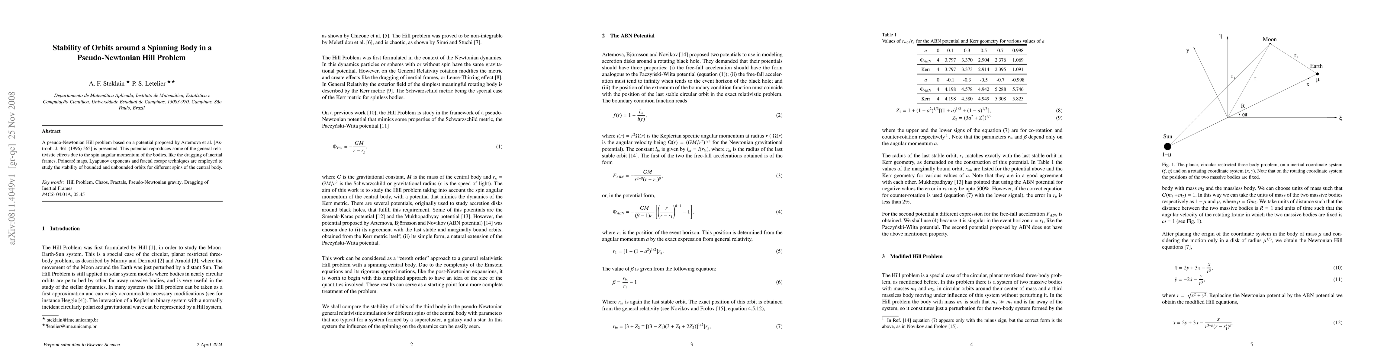 This paper investigates the stability of orbits around a spinning body using a pseudo-Newtonian Hill problem, incorporating relativistic effects from spin angular momentum. It employs Poincare maps, Lyapunov exponents, and fractal escape techniques to analyze both bounded and unbounded orbits for varying central body spins.