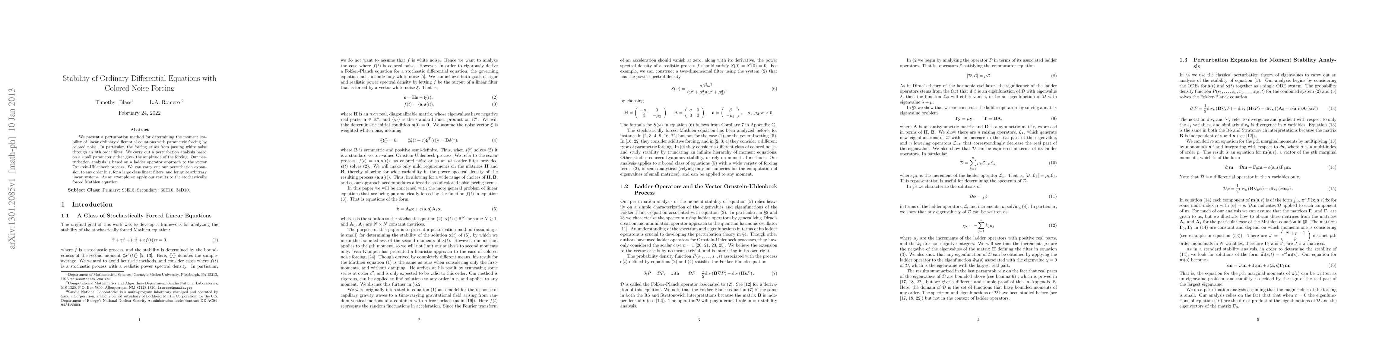 We present a perturbation method for determining the moment stability of linear ordinary differential equations with parametric forcing by colored noise. In particular, the forcing arises from passing white noise through an $n$th order filter. We carry out a perturbation analysis based on a small parameter $\varepsilon$ that gives the amplitude of the forcing. Our perturbation analysis is based on a ladder operator approach to the vector Ornstein-Uhlenbeck process. We can carry out our perturbation expansion to any order in $\varepsilon$, for a large class linear filters, and for quite arbitrary linear systems. As an example we apply our results to the stochastically forced Mathieu equation.