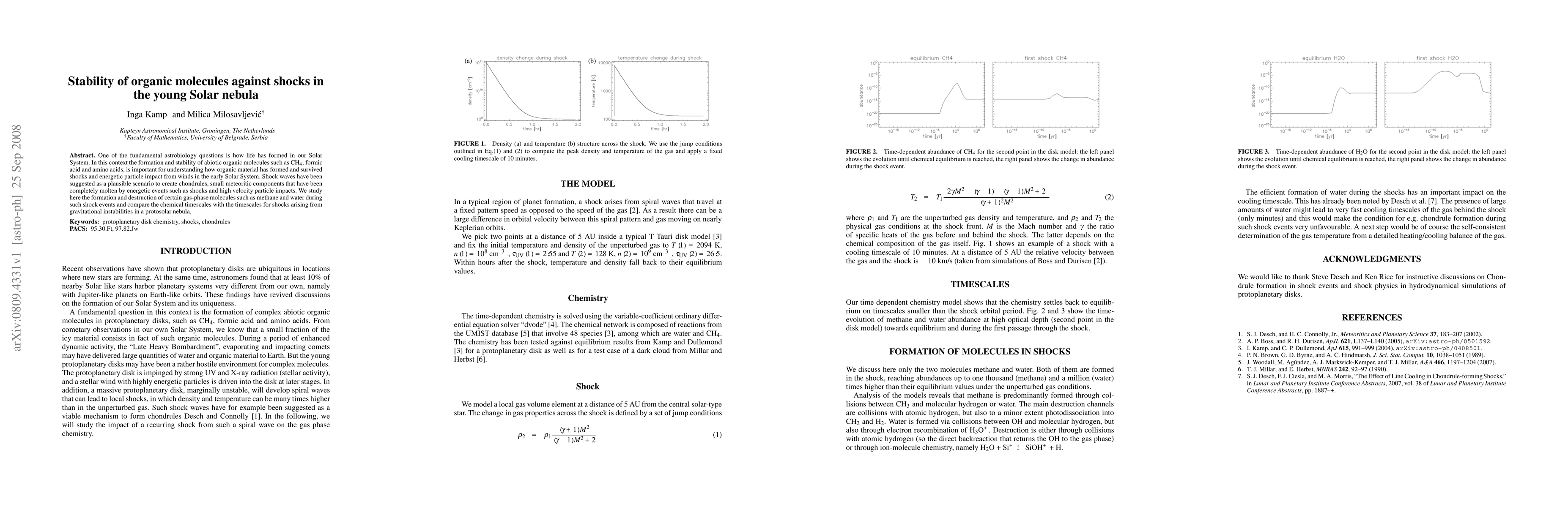 This research investigates the stability of organic molecules like methane and formic acid against shocks in the young Solar nebula, aiming to understand how organic material survived energetic events and impacts, which are crucial for astrobiology and the formation of chondrules. The study compares chemical reaction timescales with those of shock waves from gravitational instabilities.