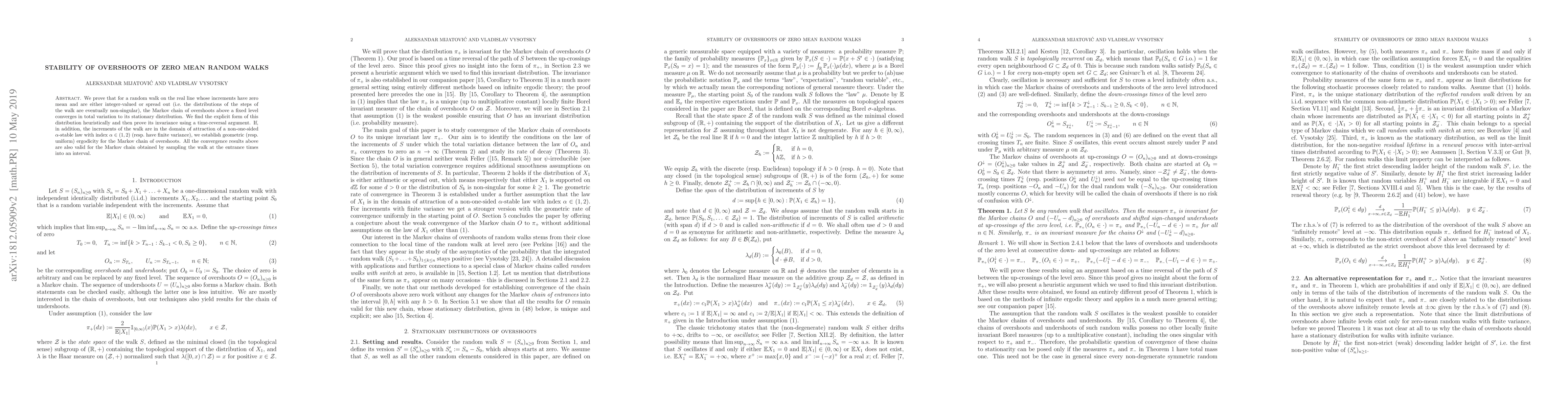 This paper proves the convergence of the Markov chain of overshoots in zero mean random walks to a stationary distribution, establishing geometric or uniform ergodicity depending on the distribution of the increments. The convergence is shown via a time-reversal argument and verified for walks with either non-singular or stable distribution steps.