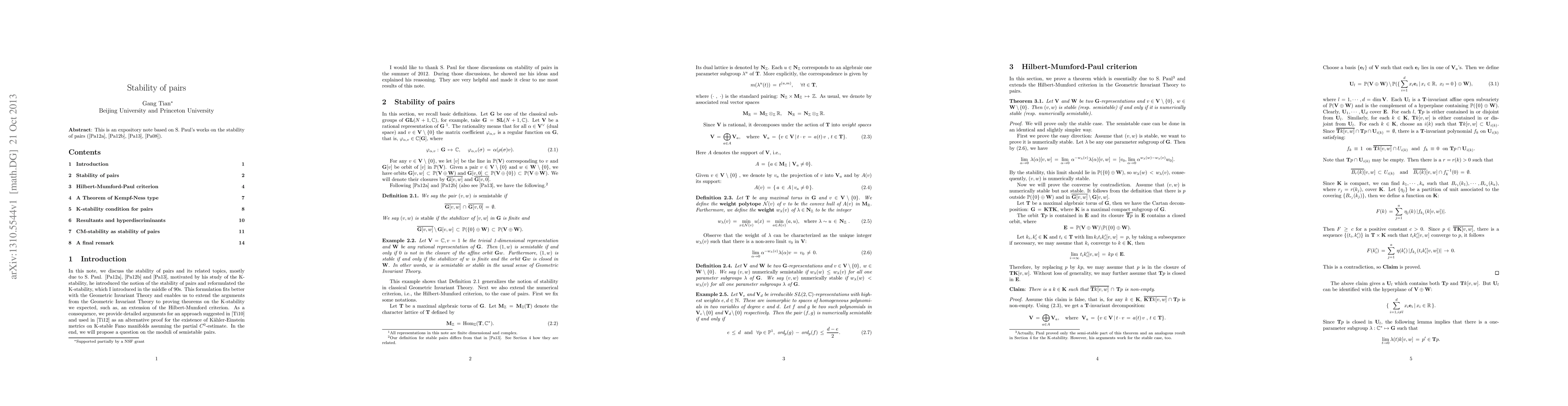 This research note explores the stability of pairs in relation to K-stability, a concept from S. Paul's work, without providing specific findings or methodology.