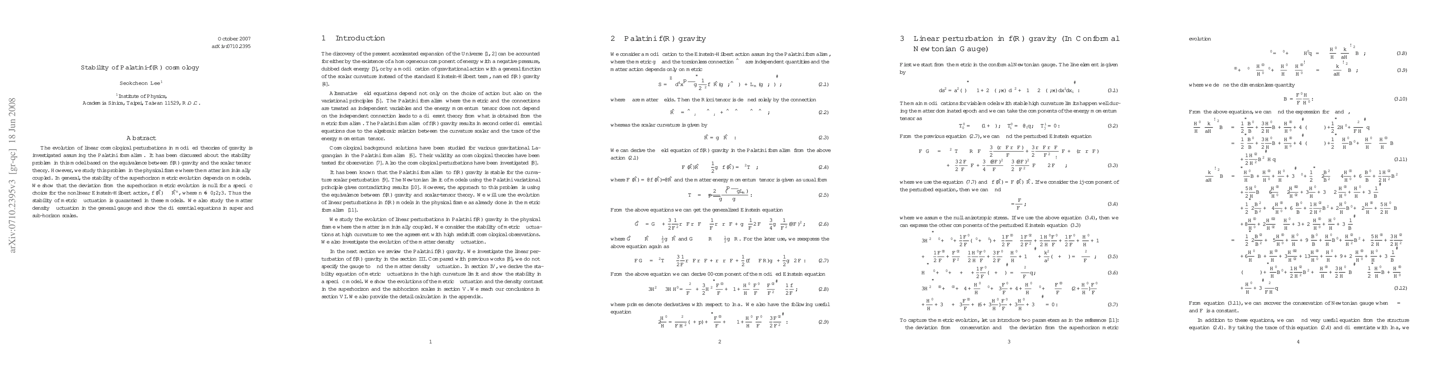 The evolution of linear cosmological perturbations in modified theories of gravity is investigated assuming the Palatini formalism. It has been discussed about the stability problem in this model based on the equivalence between f(R) gravity and the scalar tensor theory. However, we study this problem in the physical frame where the matter is minimally coupled. In general, the stability of the superhorizon metric evolution depends on models. We show that the deviation from the superhorizon metric evolution is null for a specific choice for the nonlinear Einstein-Hilbert action, $f(\hat{R}) \sim \hat{R}^{n}$, where $n \neq 0,2,3$. Thus the stability of metric fluctuation is guaranteed in these models. We also study the matter density fluctuation in the general gauge and show the differential equations in super and sub-horizon scales.