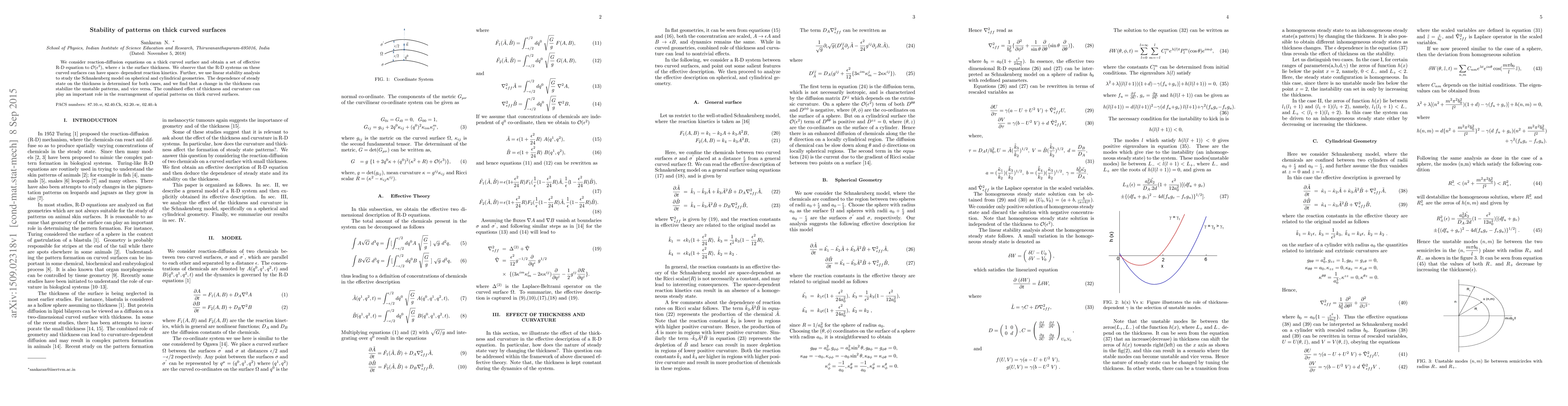 This paper studies reaction-diffusion equations on thick curved surfaces, deriving effective equations to second order in surface thickness. It finds that these systems can exhibit spatially varying reaction kinetics and shows through stability analysis that surface thickness can stabilize or destabilize patterns in the Schnakenberg model on spherical and cylindrical geometries.