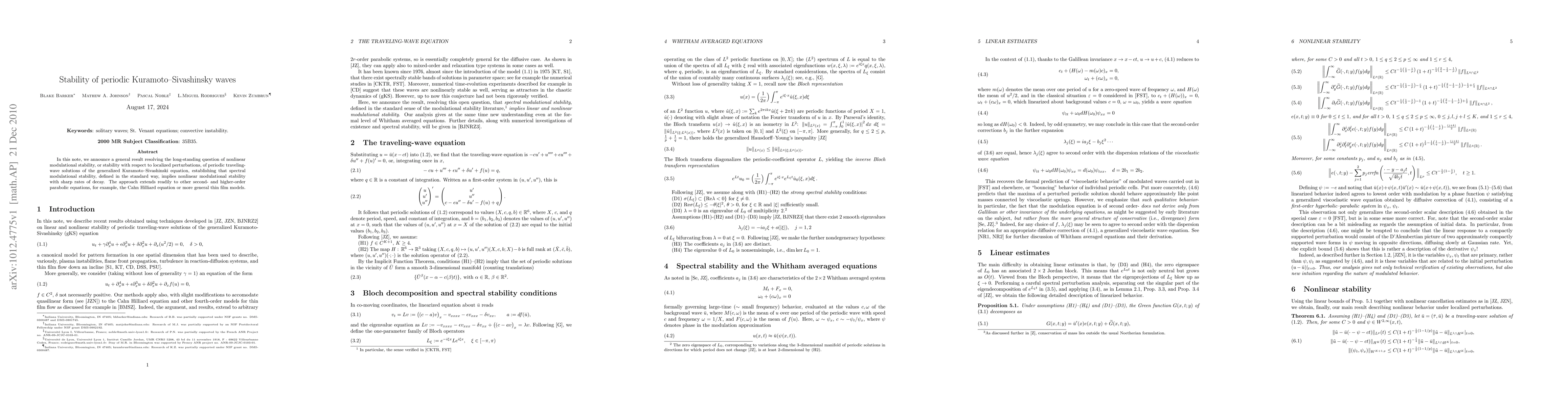 In this note, we announce a general result resolving the long-standing question of nonlinear modulational stability, or stability with respect to localized perturbations, of periodic traveling-wave solutions of the generalized Kuramoto-Sivashinsky equation, establishing that spectral modulational stability, defined in the standard way, implies nonlinear modulational stability with sharp rates of decay. The approach extends readily to other second- and higher-order parabolic equations, for example, the Cahn-Hilliard equation or more general thin film models.