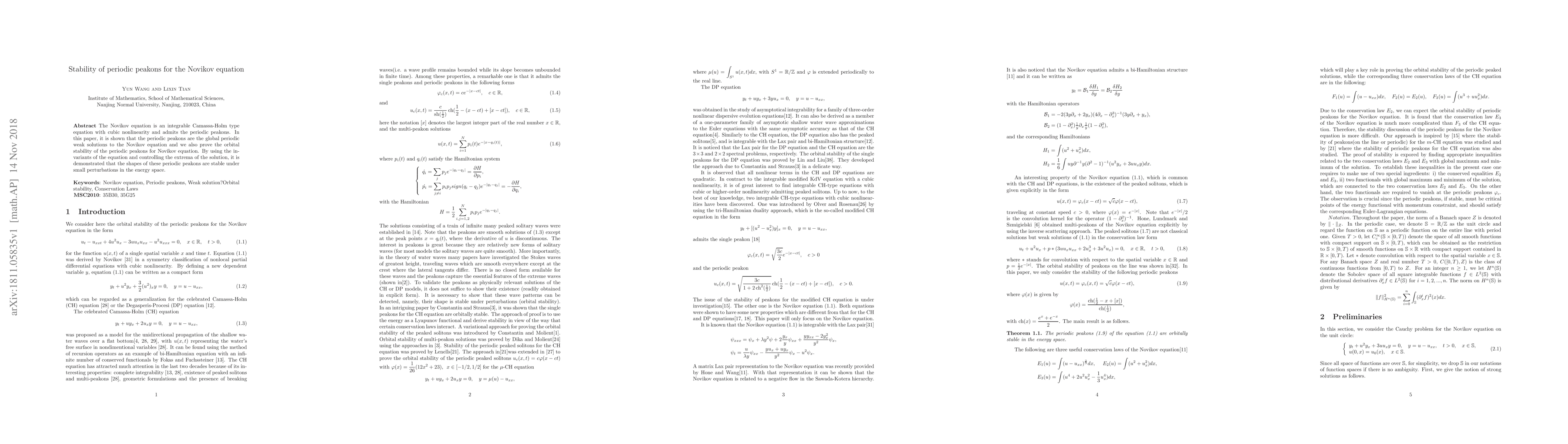 This paper proves that periodic peakons are global weak solutions to the Novikov equation and demonstrates their orbital stability under small perturbations. The stability is shown by leveraging the equation's invariants and controlling the solution's extrema in the energy space.