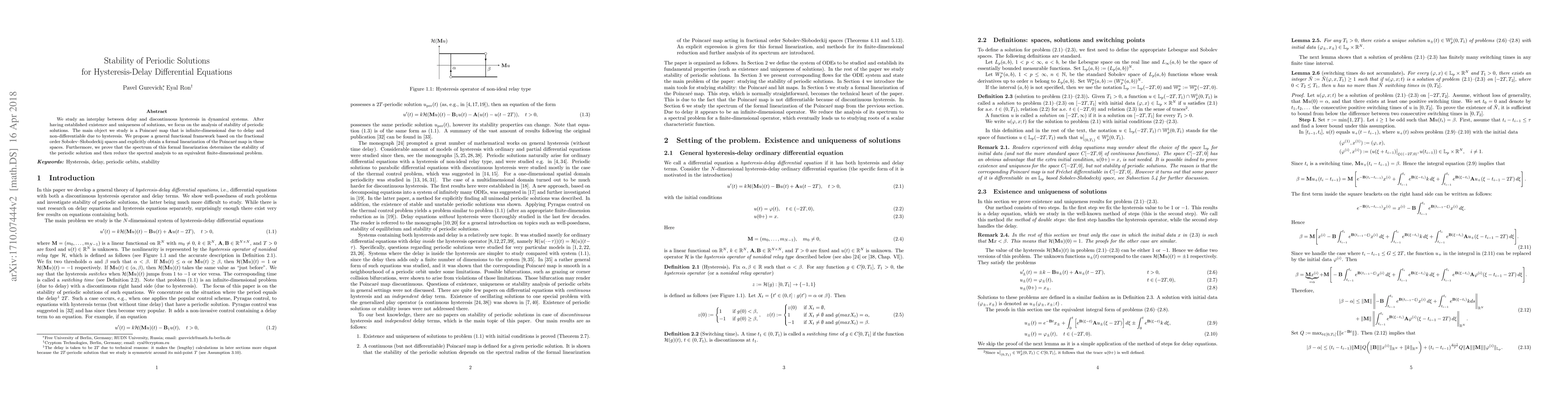 This paper studies the stability of periodic solutions in dynamical systems with delay and hysteresis, proposing a framework to analyze its impact on stability and reducing spectral analysis to finite-dimensional problems.