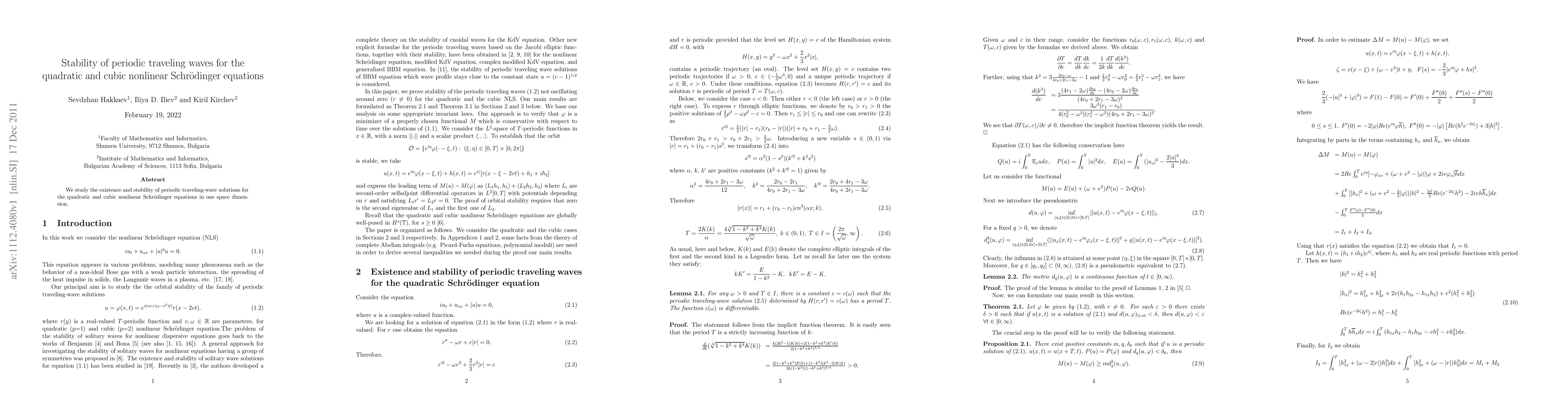 Summary: This paper investigates the existence and stability of periodic traveling-wave solutions for the quadratic and cubic nonlinear Schrödinger equations in one-dimensional space. The study focuses on the conditions under which these solutions remain stable.