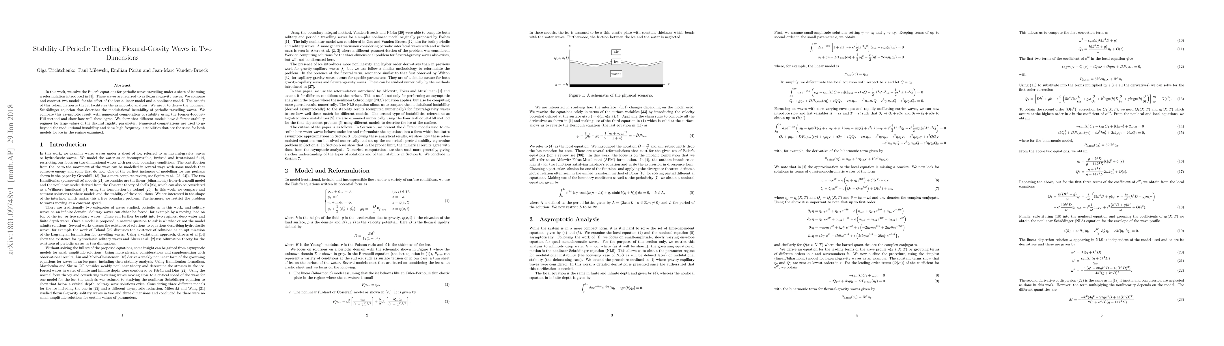 In this work, we solve the Euler's equations for periodic waves travelling under a sheet of ice using a reformulation introduced in Ablowitz et al. (2006). These waves are referred to as flexural-gravity waves. We compare and contrast two models for the effect of the ice: a linear model and a nonlinear model. The benefit of this reformulation is that it facilitates the asymptotic analysis. We use it to derive the nonlinear Schrodinger equation that describes the modulational instability of periodic travelling waves. We compare this asymptotic result with numerical computation of stability using the Fourier-Floquet-Hill method and show how well these agree. We show that different models have different stability regimes for large values of the flexural rigidity parameter. Numerical computations are used to go beyond the modulational instability and show high frequency instabilities that are the same for both models for ice in the regime examined.
