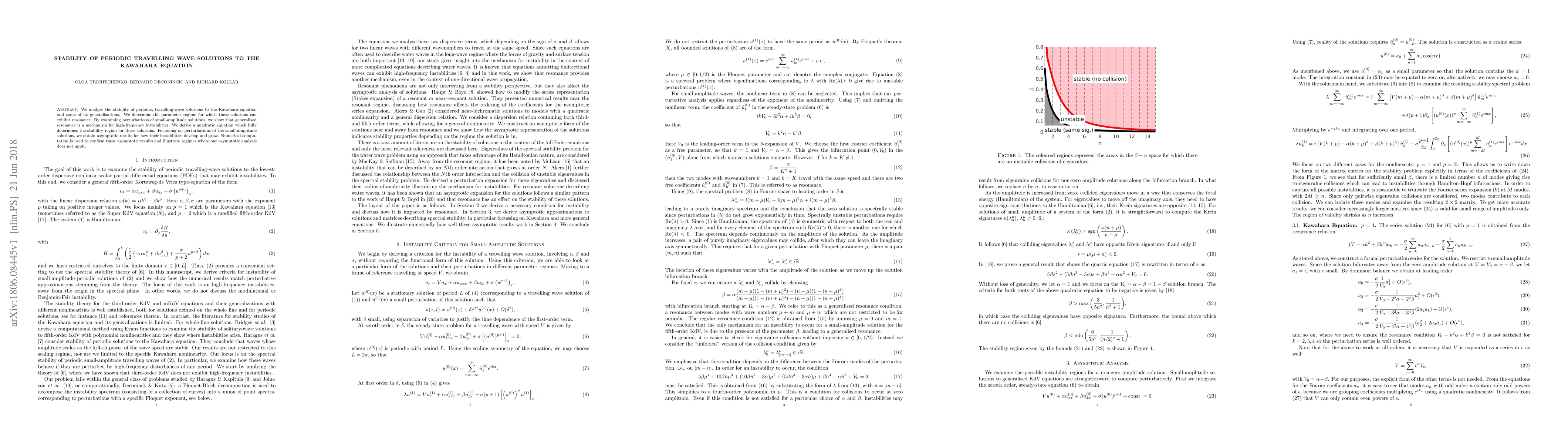 This paper investigates the stability of periodic travelling wave solutions to the Kawahara equation and its generalizations, identifying the parameter regime for resonance and high-frequency instabilities. It derives a quadratic equation to determine the stability region and uses asymptotic analysis and numerical computation to confirm the development and growth of instabilities.