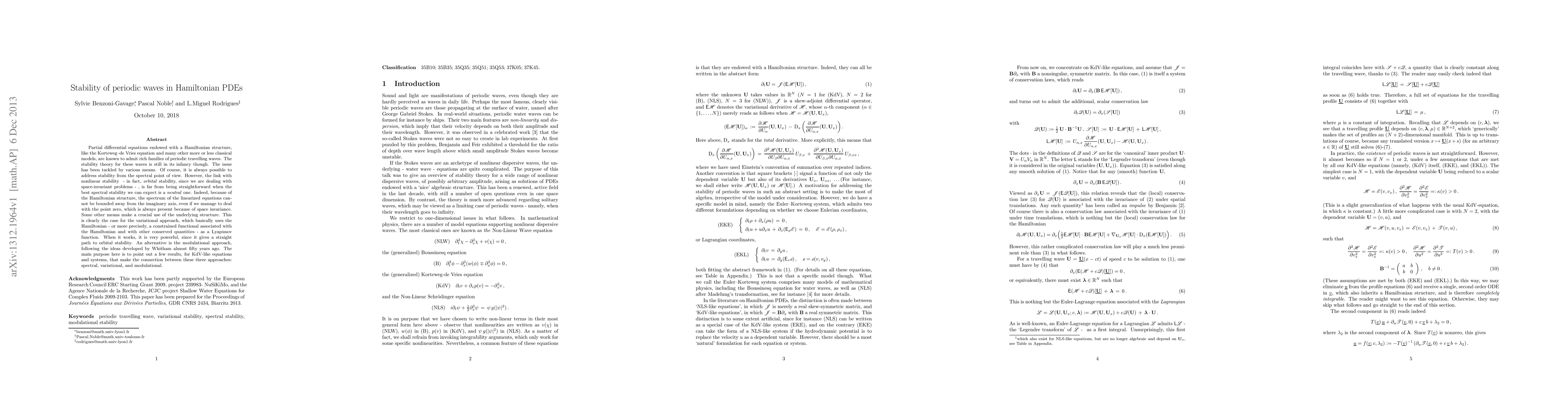 Research investigates stability of periodic waves in Hamiltonian PDEs, exploring connections between spectral, variational, and modulational approaches to achieve orbital stability.