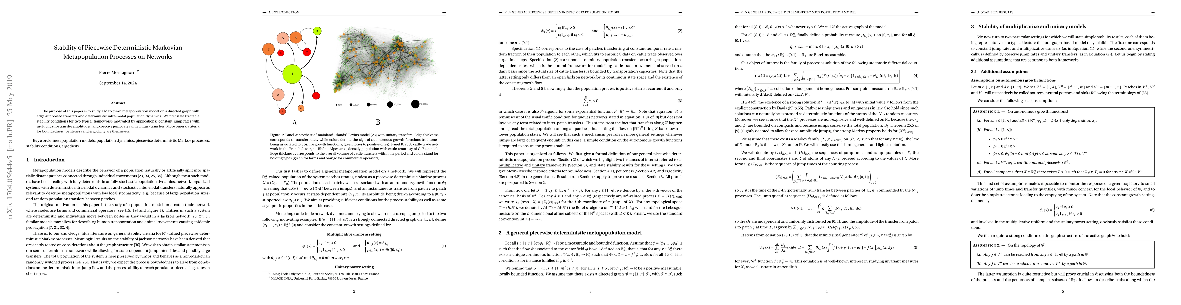 This paper studies stability conditions for Markovian metapopulation models on networks with deterministic dynamics and edge-supported transfers. It provides general criteria for boundedness, petiteness, and ergodicity in various scenarios.