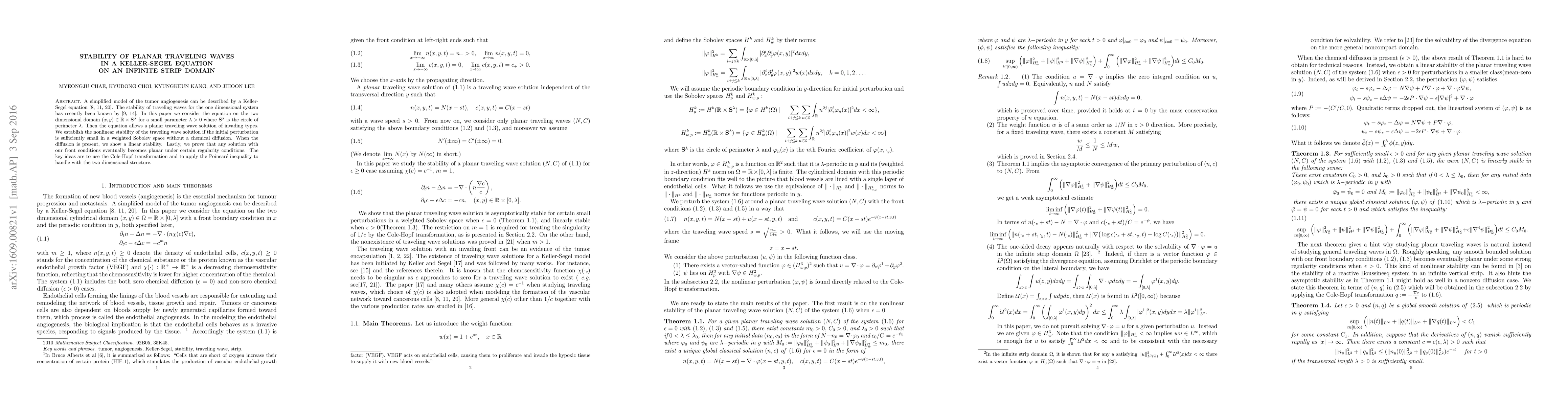 This paper investigates the stability of planar traveling waves in a Keller-Segel equation on an infinite strip domain. It establishes nonlinear stability for small perturbations without diffusion and linear stability with diffusion, using the Cole-Hopf transformation and Poincaré inequality to handle the two-dimensional structure.