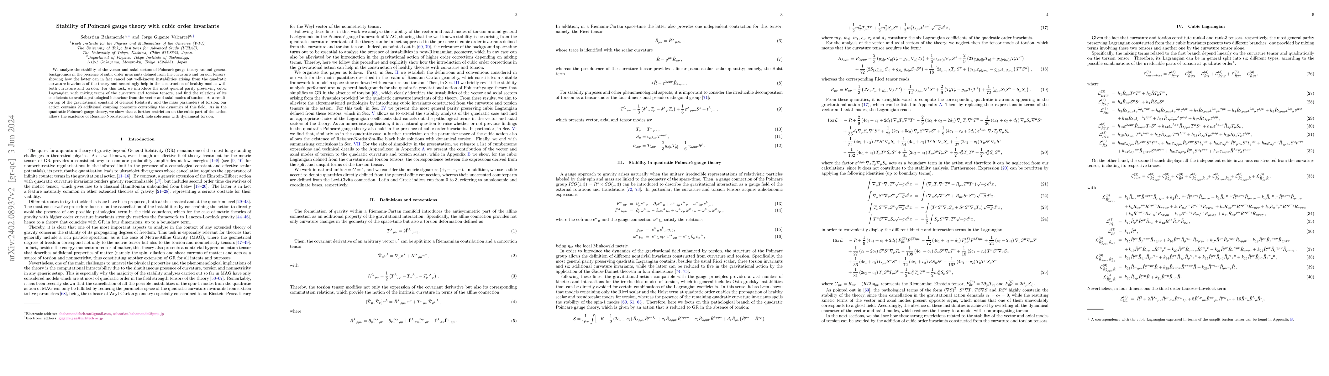 We analyse the stability of the vector and axial sectors of Poincar\'e gauge theory around general backgrounds in the presence of cubic order invariants defined from the curvature and torsion tensors, showing how the latter can in fact cancel out well-known instabilities arising from the quadratic curvature invariants of the theory and accordingly help in the construction of healthy models with both curvature and torsion. For this task, we introduce the most general parity preserving cubic Lagrangian with mixing terms of the curvature and torsion tensors, and find the relations of its coefficients to avoid a pathological behaviour from the vector and axial modes of torsion. As a result, on top of the gravitational constant of General Relativity and the mass parameters of torsion, our action contains 23 additional coupling constants controlling the dynamics of this field. As in the quadratic Poincar\'e gauge theory, we show that a further restriction on the cubic part of the action allows the existence of Reissner-Nordstr\"om-like black hole solutions with dynamical torsion.