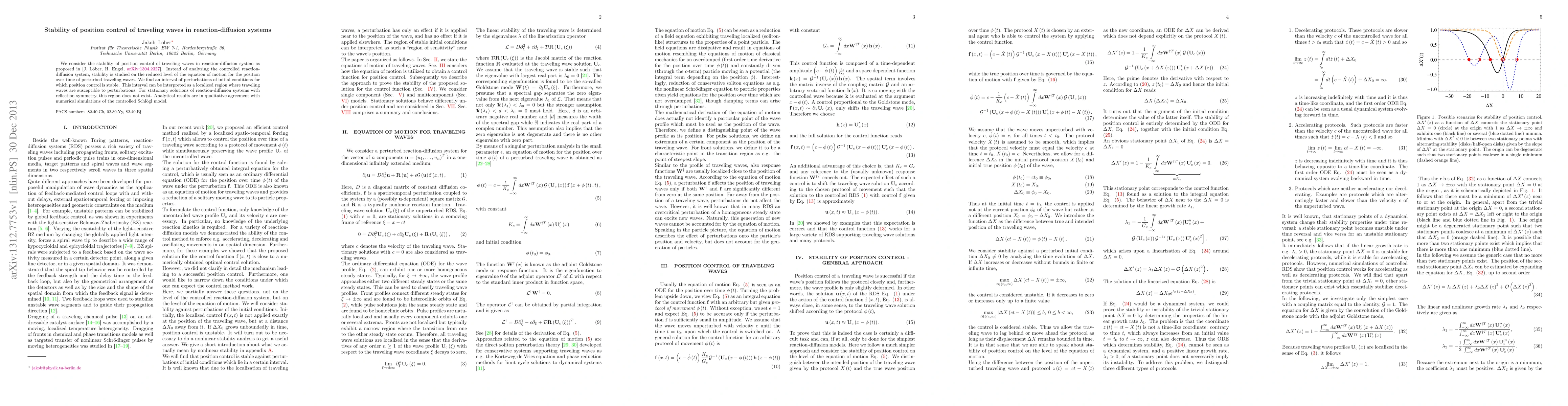 This paper investigates the stability of position control for traveling waves in reaction-diffusion systems, focusing on the stability of the wave's position over time. The study finds an interval of initial condition perturbations where position control remains stable, highlighting a localized region of susceptibility to perturbations, which does not occur for stationary solutions with reflection symmetry. Analytical findings are corroborated by numerical simulations of the controlled Schlögl model.