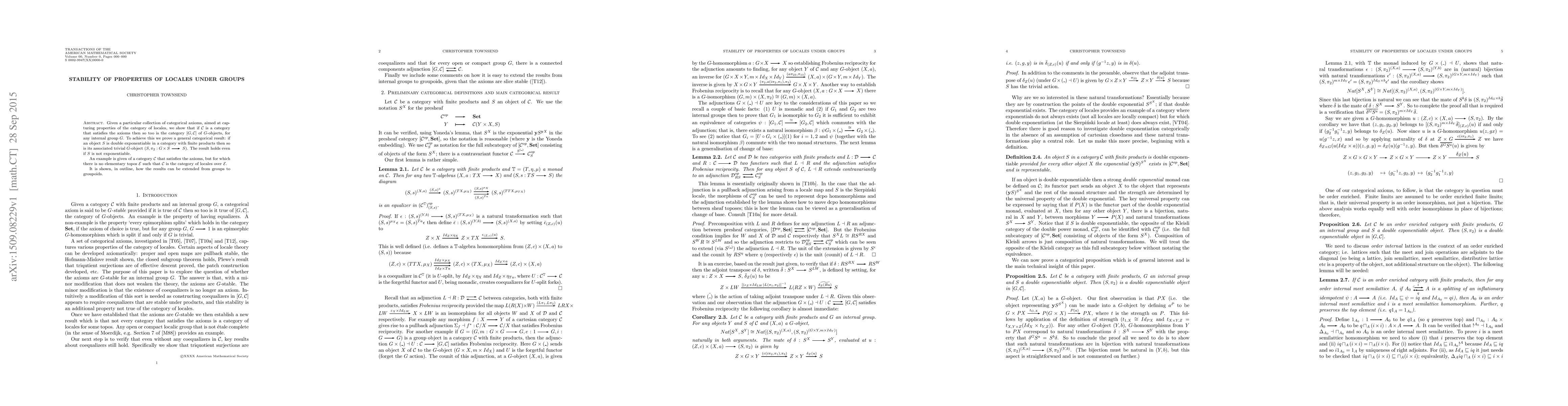 Given a particular collection of categorical axioms, aimed at capturing properties of the category of locales, we show that if $\mathcal{C}$ is a category that satisfies the axioms then so too is the category $[ G, \mathcal{C}]$ of $G$-objects, for any internal group $G$. To achieve this we prove a general categorical result: if an object $S$ is double exponentiable in a category with finite products then so is its associated trivial $G$-object $(S, \pi_2: G \times S \rightarrow S)$. The result holds even if $S$ is not exponentiable. An example is given of a category $\mathcal{C}$ that satisfies the axioms, but for which there is no elementary topos $\mathcal{E}$ such that $\mathcal{C}$ is the category of locales over $\mathcal{E}$. It is shown, in outline, how the results can be extended from groups to groupoids.