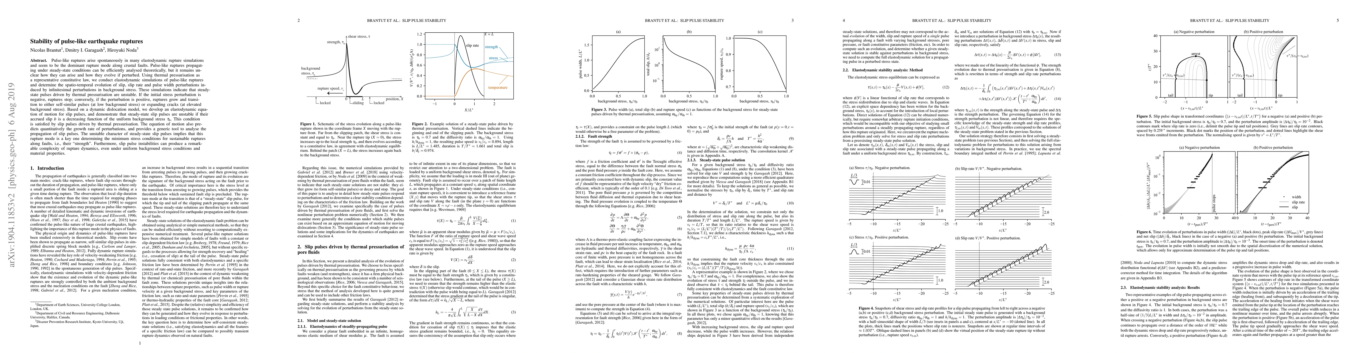 Pulse-like ruptures arise spontaneously in many elastodynamic rupture simulations and seem to be the dominant rupture mode along crustal faults. Pulse-like ruptures propagating under steady-state conditions can be efficiently analysed theoretically, but it remains unclear how they can arise and how they evolve if perturbed. Using thermal pressurisation as a representative constitutive law, we conduct elastodynamic simulations of pulse-like ruptures and determine the spatio-temporal evolution of slip, slip rate and pulse width perturbations induced by infinitesimal perturbations in background stress. These simulations indicate that steady-state pulses driven by thermal pressurisation are unstable. If the initial stress perturbation is negative, ruptures stop; conversely, if the perturbation is positive, ruptures grow and transition to either self-similar pulses (at low background stress) or expanding cracks (at elevated background stress). Based on a dynamic dislocation model, we develop an elastodynamic equation of motion for slip pulses, and demonstrate that steady-state slip pulses are unstable if their accrued slip $b$ is a decreasing function of the uniform background stress $\tau_\mathrm{b}$. This condition is satisfied by slip pulses driven by thermal pressurisation. The equation of motion also predicts quantitatively the growth rate of perturbations, and provides a generic tool to analyse the propagation of slip pulses. The unstable character of steady-state slip pulses implies that this rupture mode is a key one determining the minimum stress conditions for sustainable ruptures along faults, i.e., their ``strength''. Furthermore, slip pulse instabilities can produce a remarkable complexity of rupture dynamics, even under uniform background stress conditions and material properties.