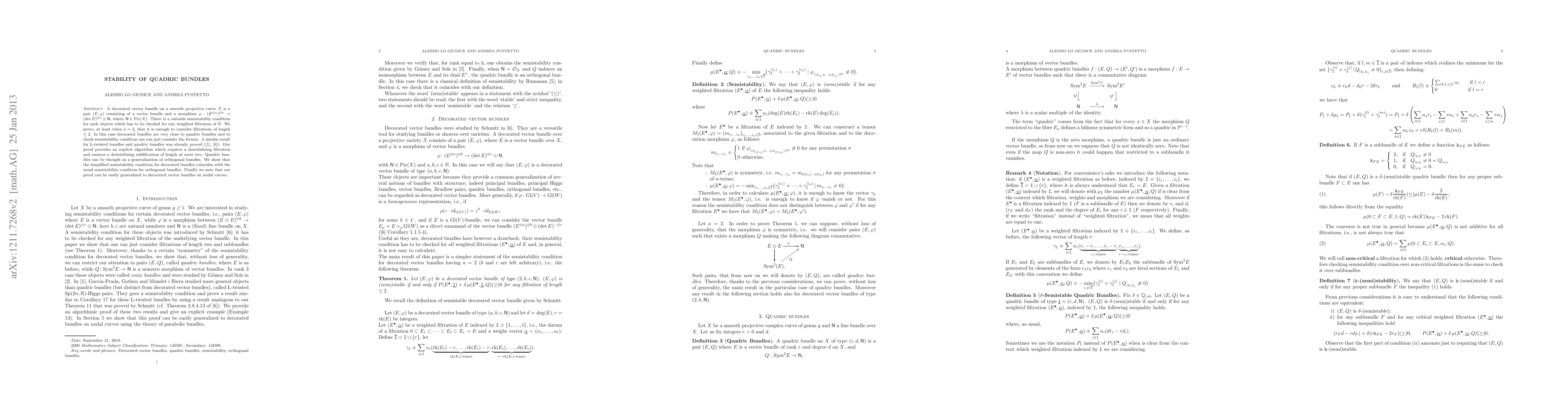 Let $(E,\varphi)$ be decorated vector bundle of type $(a,b,c,N)$ on a smooth projective curve $X$. There is a suitable semistability condition for such objects which has to be checked for any weighted filtration of $E$. We prove, at least when $a=2$, that it is enough to consider filtrations of length less or equal than two. In this case decorated bundles are very close to quadric bundles and to check semistability condition one can just consider the former. A similar result for L-twisted bundles and quadric bundles was already proved. Our proof provides an explicit algorithm which requires a destabilizing filtration and ensures a destabilizing subfiltration of length at most two. Quadric bundles can be thought as a generalization of orthogonal bundles. We show that the simplified semistability condition for decorated bundles coincides with the usual semistability condition for orthogonal bundles. Finally we note that our proof can be easily generalized to decorated vector bundles on nodal curves.