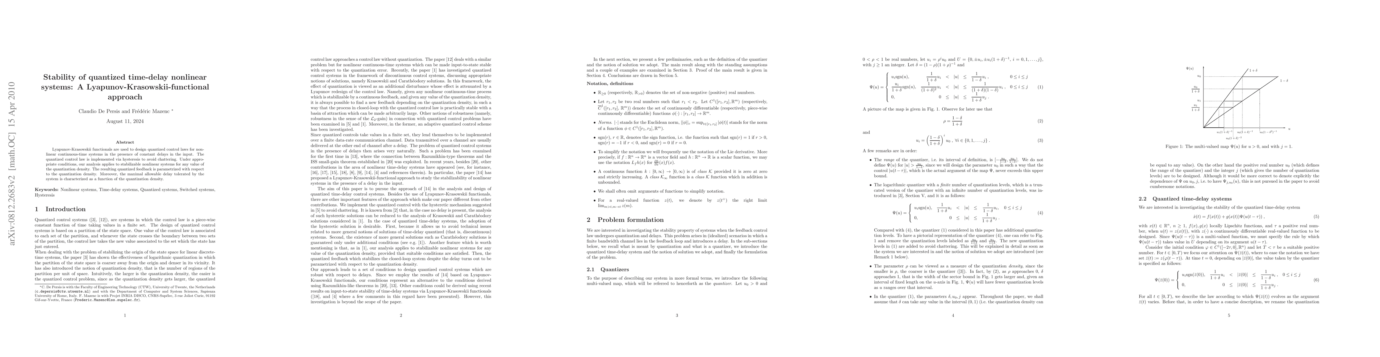 This paper employs Lyapunov-Krasowskii functionals to develop quantized control laws for continuous-time nonlinear systems with constant input delays, ensuring stability via hysteresis to avoid chattering. The analysis characterizes the maximal delay tolerance as a function of quantization density.
