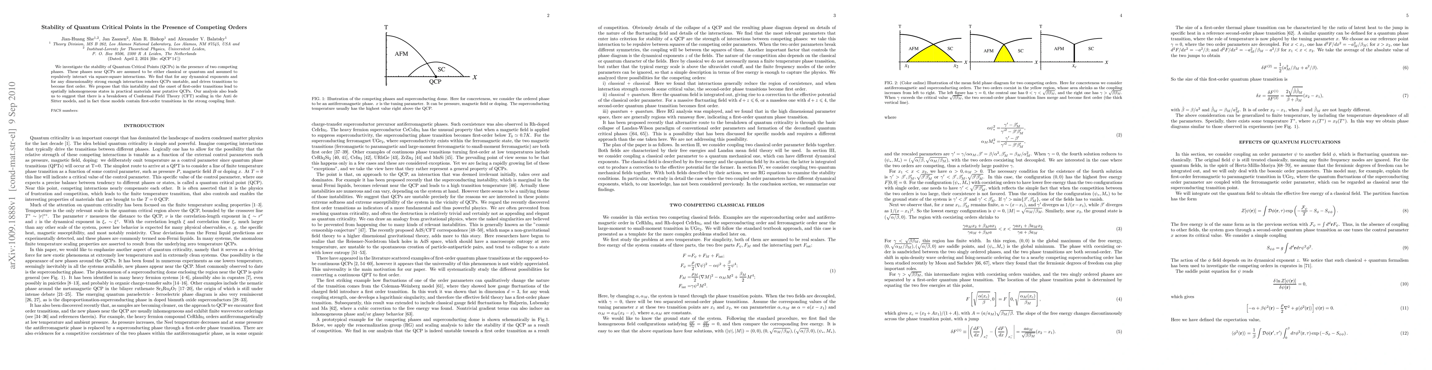 We investigate the stability of Quantum Critical Points (QCPs) in the presence of two competing phases. These phases near QCPs are assumed to be either classical or quantum and assumed to repulsively interact via square-square interactions. We find that for any dynamical exponents and for any dimensionality strong enough interaction renders QCPs unstable, and drives transitions to become first order. We propose that this instability and the onset of first-order transitions lead to spatially inhomogeneous states in practical materials near putative QCPs. Our analysis also leads us to suggest that there is a breakdown of Conformal Field Theory (CFT) scaling in the Anti de Sitter models, and in fact these models contain first-order transitions in the strong coupling limit.