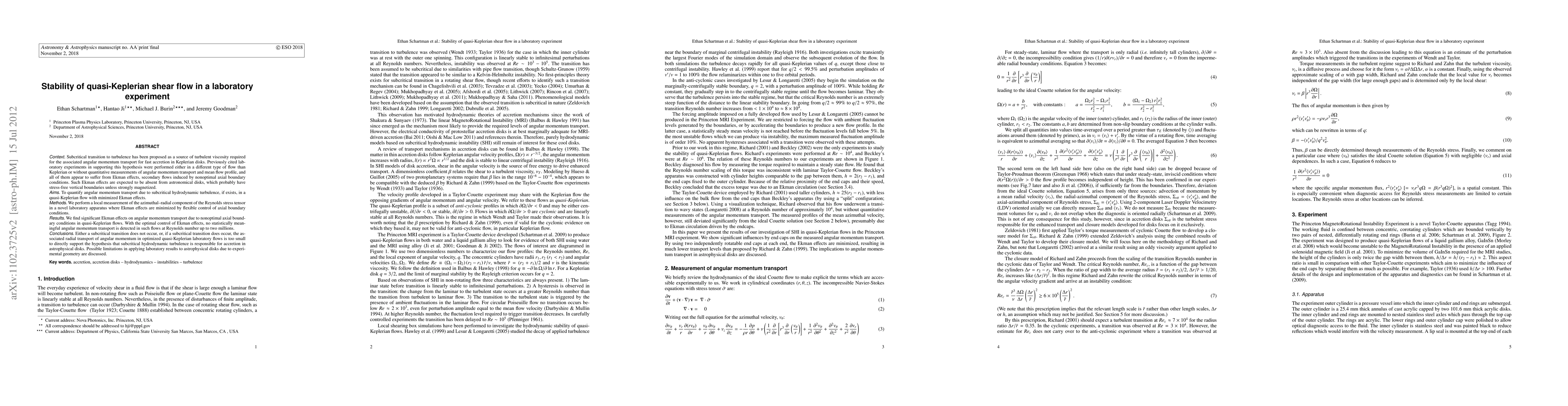 This study investigates the stability of quasi-Keplerian shear flow in a laboratory setting to determine if subcritical transition to turbulence can account for angular momentum transport in astrophysical disks. The experiment finds no significant angular momentum transport in optimized quasi-Keplerian flows, suggesting that subcritical turbulence may not be the primary mechanism for accretion in such disks.