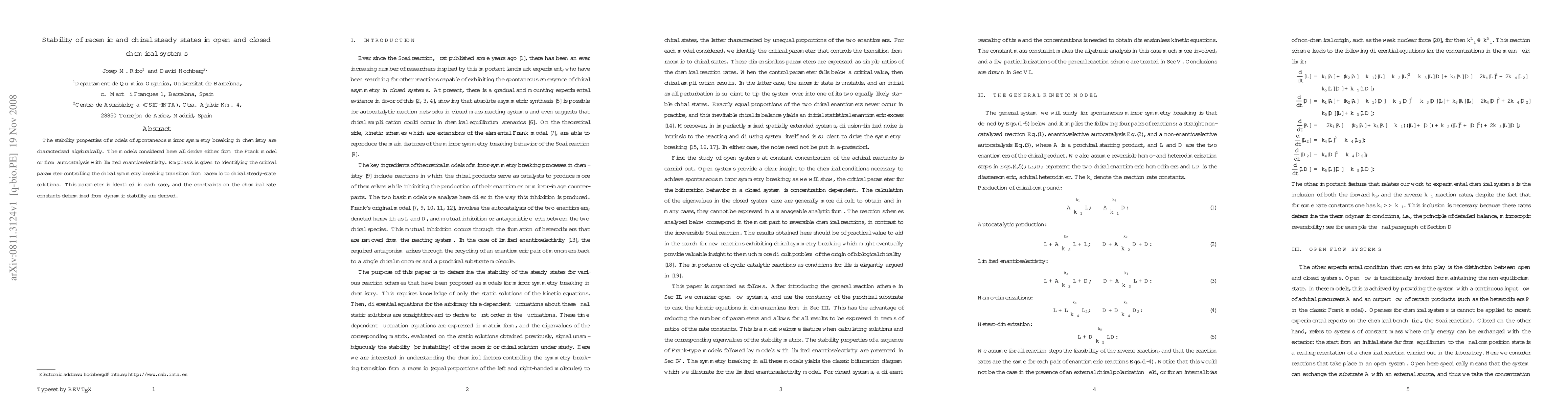 This paper investigates the stability of racemic and chiral steady states in chemical systems, focusing on models of spontaneous mirror symmetry breaking. It identifies the critical parameter that governs the transition from racemic to chiral steady states and derives constraints on chemical rate constants based on dynamic stability.