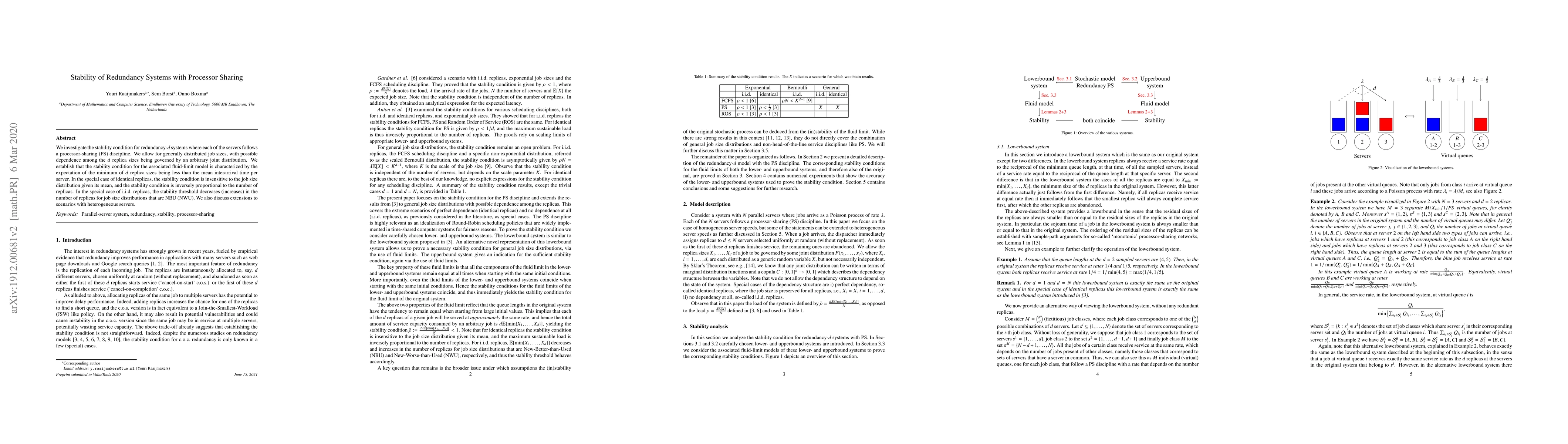 This paper explores the stability conditions for redundancy systems under processor sharing, where stability hinges on the expectation of the minimum replica size being less than the mean interarrival time. For identical replicas, stability is inversely proportional to the number of replicas, while for i.i.d. replicas, stability thresholds vary with the nature of job size distributions.
