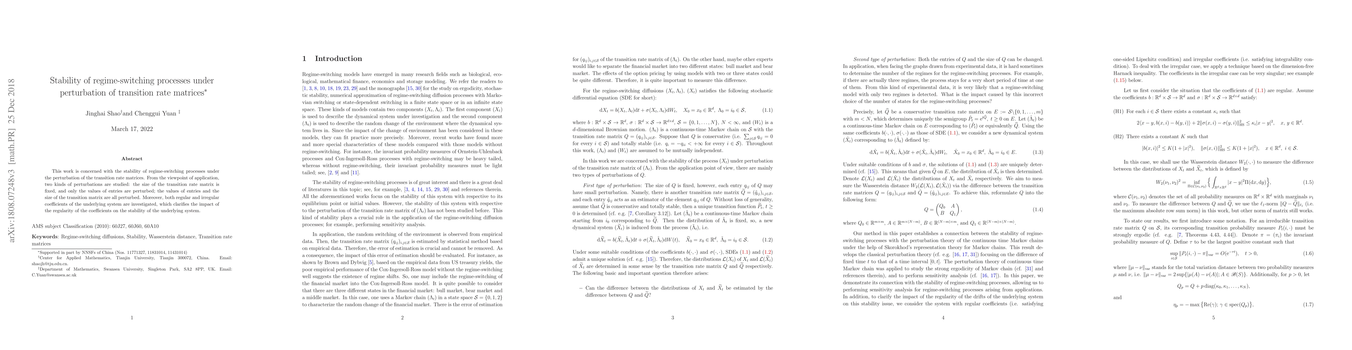 This paper examines the stability of regime-switching processes when the transition rate matrices are perturbed, focusing on two types of perturbations: changes in entry values with a fixed matrix size, and changes in both entry values and matrix size. It investigates the stability under regular and irregular coefficient conditions to elucidate the impact of coefficient regularity on system stability.