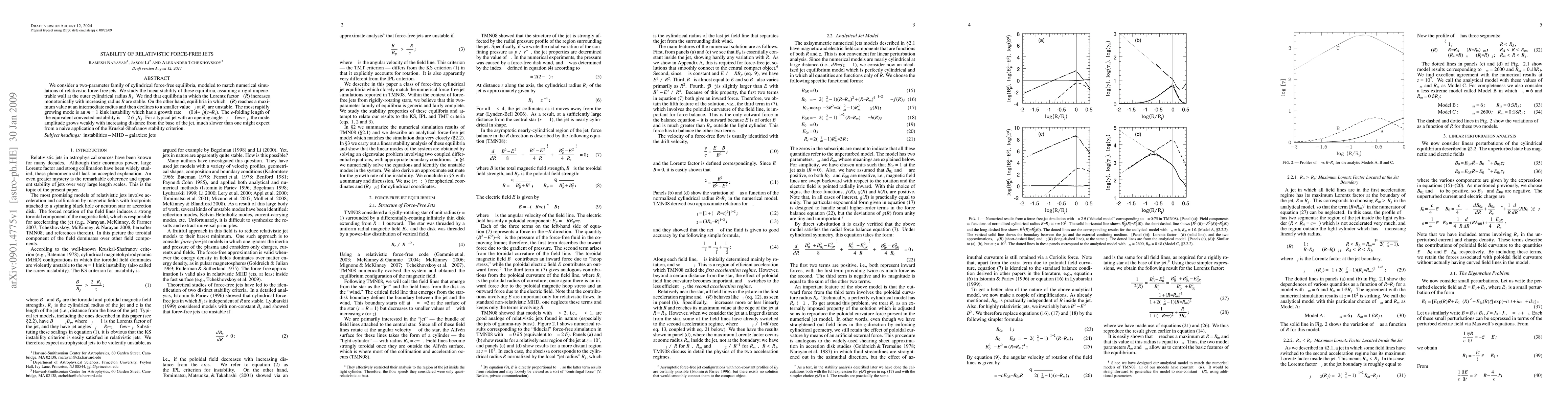 This paper investigates the linear stability of relativistic force-free jet equilibria, finding that monotonically increasing Lorentz factor equilibria are stable, while those with a peak and decline are unstable. The m=1 kink instability is the most rapidly growing mode.