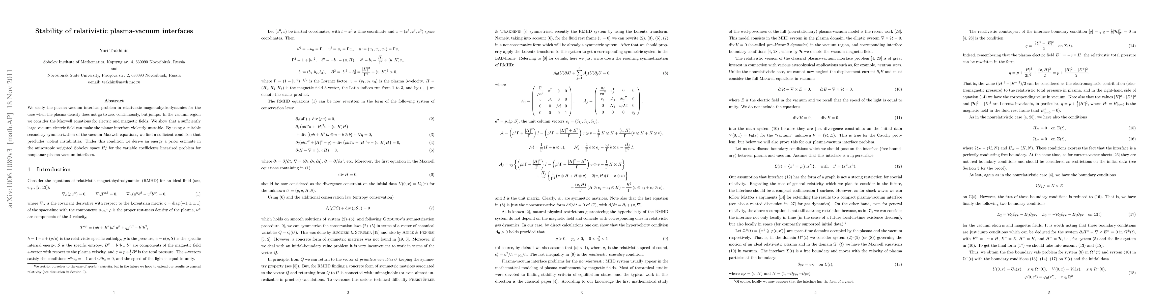 This research explores the stability of interfaces between relativistic plasma and vacuum, finding that large vacuum electric fields can cause instability. By symmetrizing vacuum Maxwell equations, the study establishes a condition to prevent such instabilities and derives an energy estimate for nonplanar interfaces in a specific mathematical space.