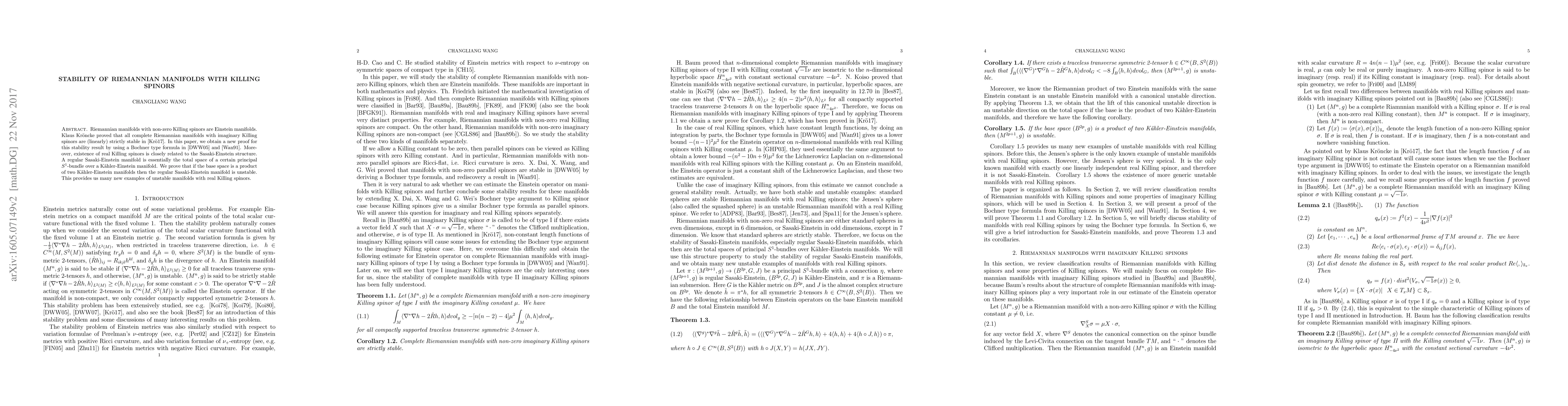 This paper presents a new proof for the stability of complete Riemannian manifolds with imaginary Killing spinors using a Bochner-type formula, and explores the relationship between real Killing spinors and Sasaki-Einstein structures, concluding that certain product Kähler-Einstein base spaces yield unstable regular Sasaki-Einstein manifolds.