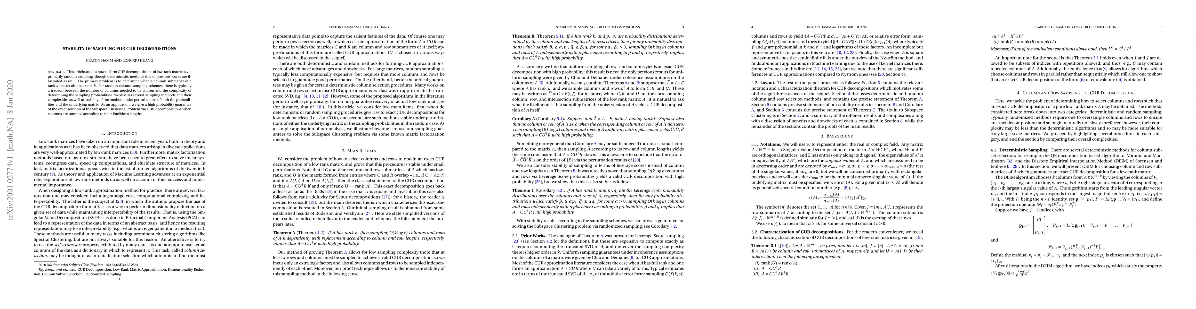 This article studies how to form CUR decompositions of low-rank matrices via primarily random sampling, though deterministic methods due to previous works are illustrated as well. The primary problem is to determine when a column submatrix of a rank $k$ matrix also has rank $k$. For random column sampling schemes, there is typically a tradeoff between the number of columns needed to be chosen and the complexity of determining the sampling probabilities. We discuss several sampling methods and their complexities as well as stability of the method under perturbations of both the probabilities and the underlying matrix. As an application, we give a high probability guarantee of the exact solution of the Subspace Clustering Problem via CUR decompositions when columns are sampled according to their Euclidean lengths.
