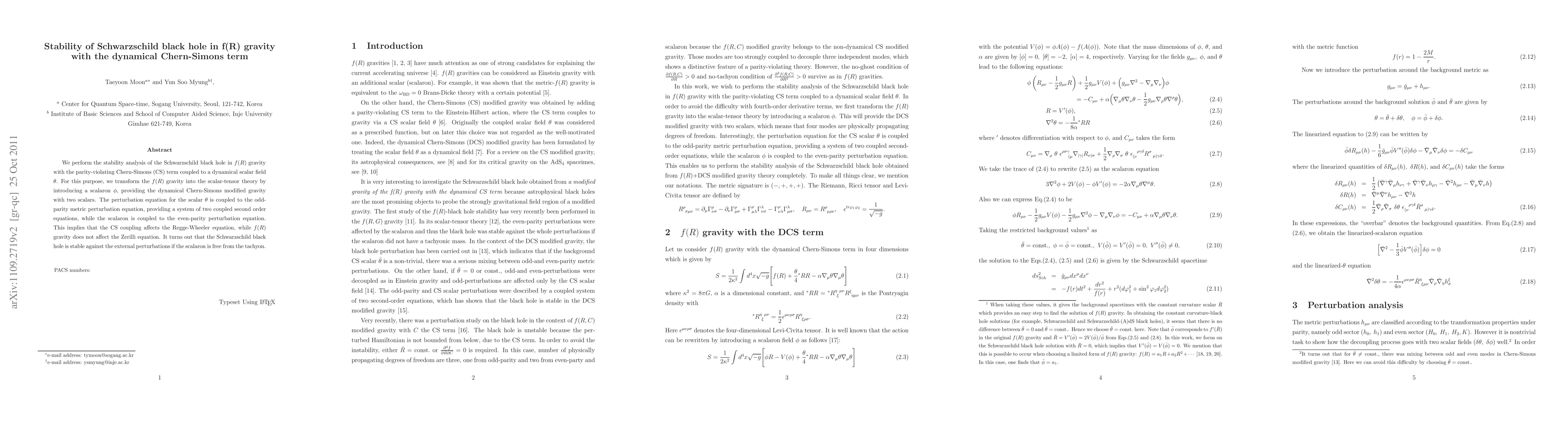 We perform the stability analysis of the Schwarzschild black hole in $f(R)$ gravity with the parity-violating Chern-Simons (CS) term coupled to a dynamical scalar field $\theta$. For this purpose, we transform the $f(R)$ gravity into the scalar-tensor theory by introducing a scalaron $\phi$, providing the dynamical Chern-Simons modified gravity with two scalars. The perturbation equation for the scalar $\theta$ is coupled to the odd-parity metric perturbation equation, providing a system of two coupled second order equations, while the scalaron is coupled to the even-parity perturbation equation. This implies that the CS coupling affects the Regge-Wheeler equation, while $f(R)$ gravity does not affect the Zerilli equation. It turns out that the Schwarzschild black hole is stable against the external perturbations if the scalaron is free from the tachyon.