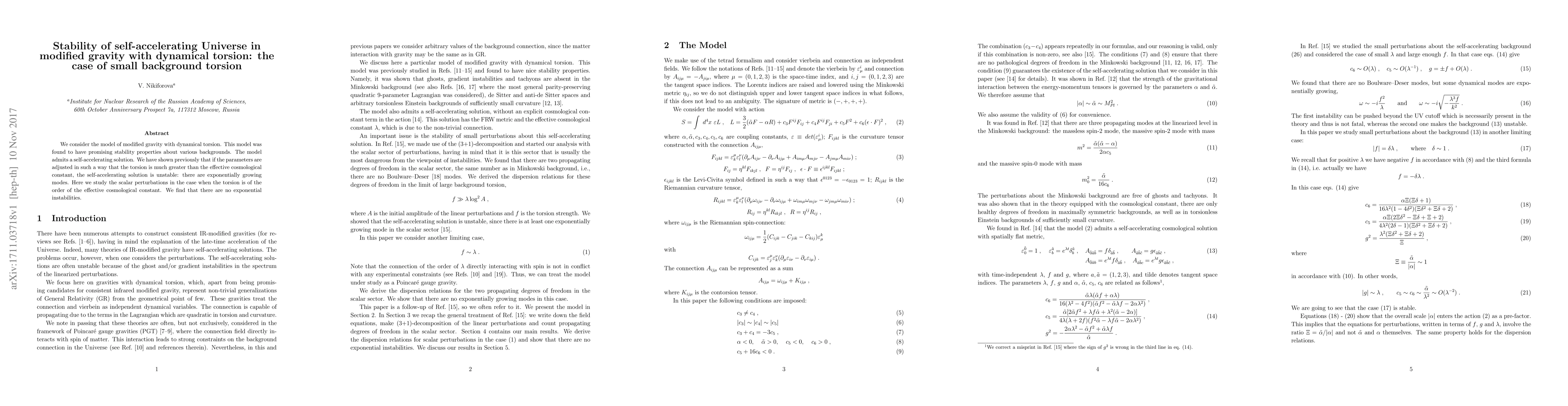 This paper investigates the stability of a self-accelerating universe in modified gravity with dynamical torsion, focusing on scenarios where the background torsion is comparable to the effective cosmological constant. It finds that under these conditions, the self-accelerating solution remains stable without exponential instabilities.