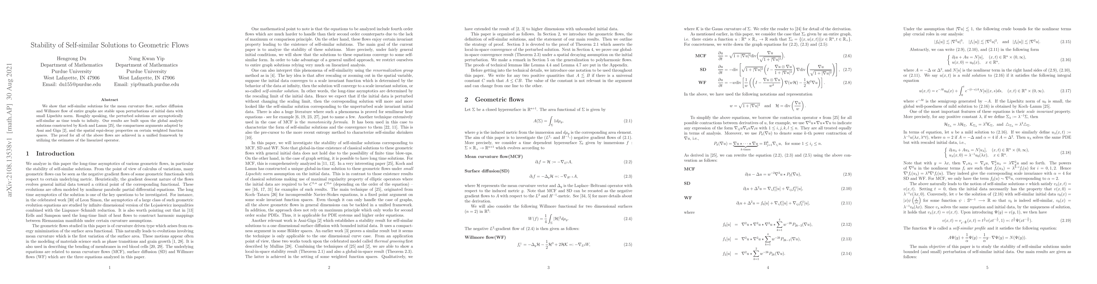 This paper proves that self-similar solutions to geometric flows remain stable under small perturbations of initial data, showing they asymptotically return to their original shape over time.