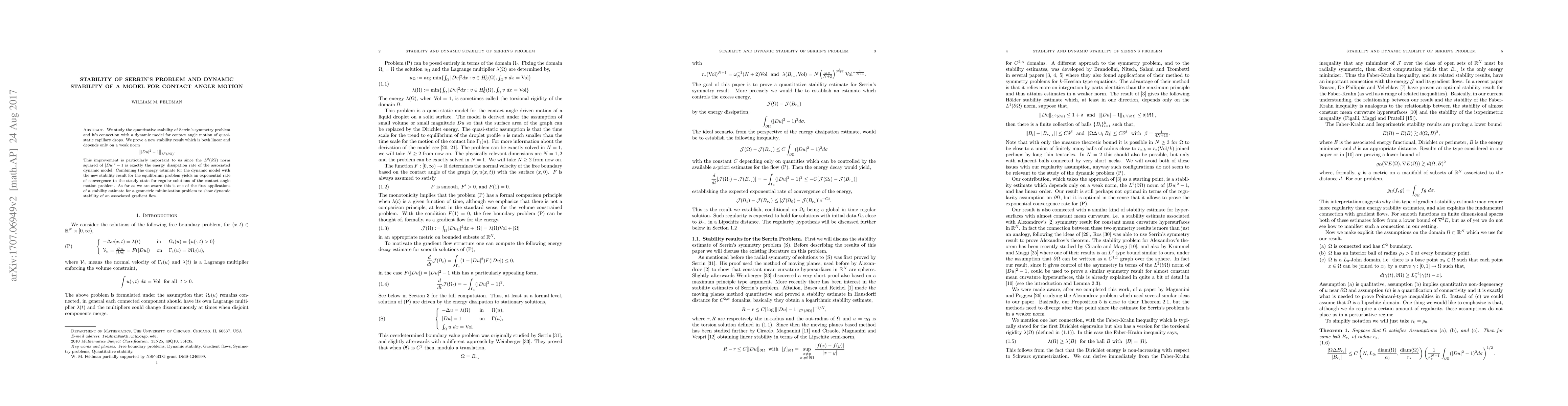 We study the quantitative stability of Serrin's symmetry problem and it's connection with a dynamic model for contact angle motion of quasi-static capillary drops. We prove a new stability result which is both linear and depends only on a weak norm \[ \big\||Du|^2- 1\big\|_{L^2(\partial \Omega)}. \] This improvement is particularly important to us since the $L^2(\partial \Omega)$ norm squared of $|Du|^2-1$ is exactly the energy dissipation rate of the associated dynamic model. Combining the energy estimate for the dynamic model with the new stability result for the equilibrium problem yields an exponential rate of convergence to the steady state for regular solutions of the contact angle motion problem. As far as we are aware this is one of the first applications of a stability estimate for a geometric minimization problem to show dynamic stability of an associated gradient flow.