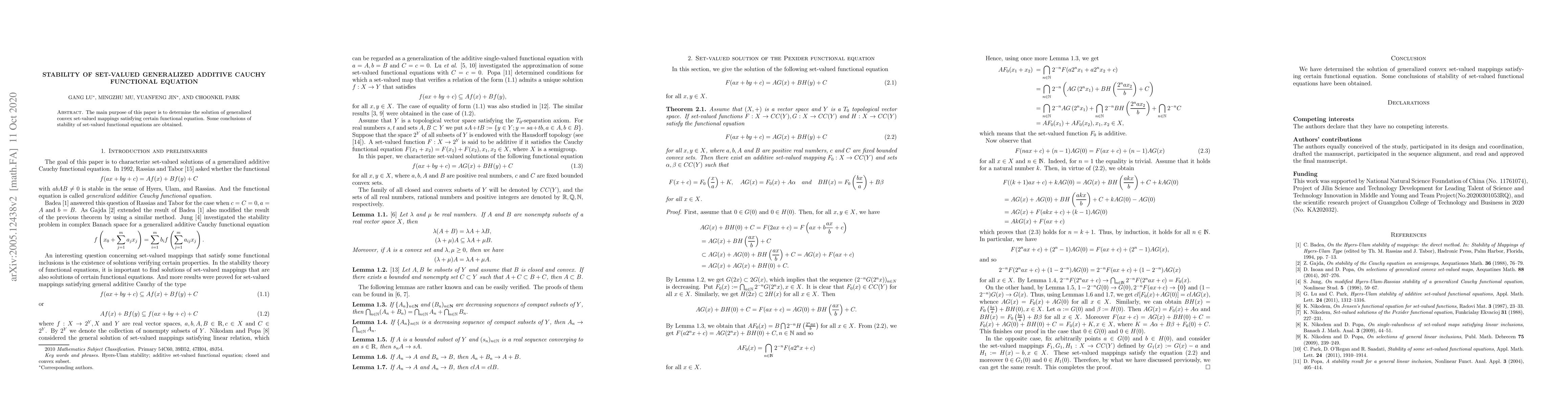 This paper investigates the stability of generalized additive Cauchy functional equations for convex set-valued mappings, establishing conditions under which these mappings maintain their solution properties. Results on the stability of set-valued functional equations are presented.