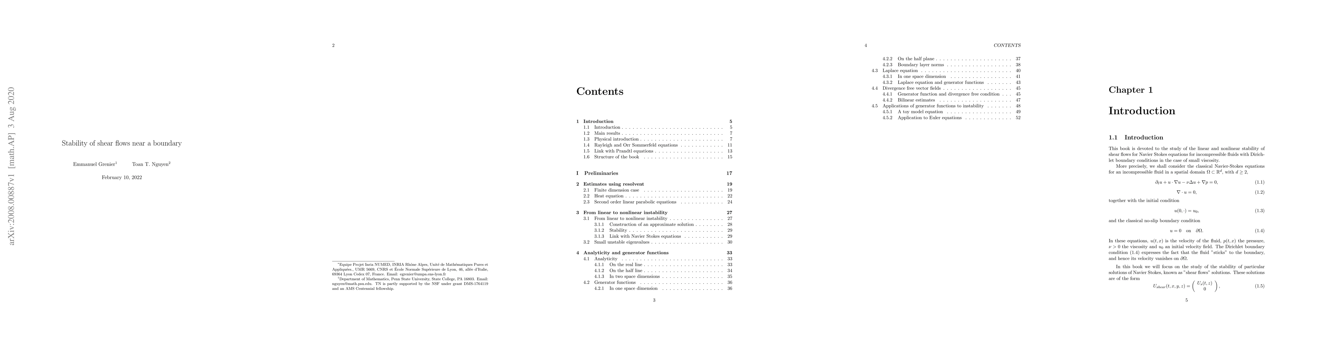 This book explores the stability of shear flows and boundary layers in incompressible fluids near boundaries, focusing on both linear and nonlinear aspects of Navier Stokes equations. It provides comprehensive coverage of recent advances, targeting graduate students and researchers in mathematical fluid dynamics.