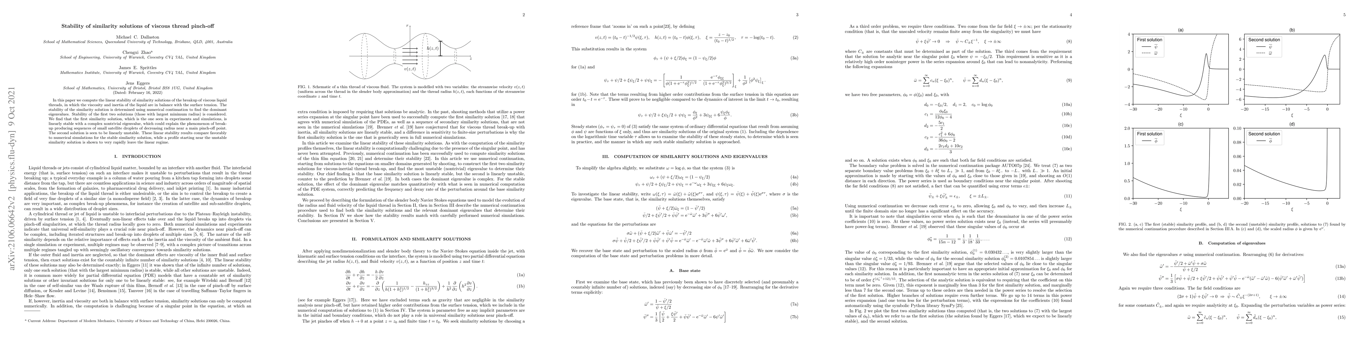 The study finds that a common similarity solution for viscous thread pinch-off is linearly stable, producing sequences of small satellite droplets, while the second solution is unstable. This stability result compares favorably with numerical simulations.