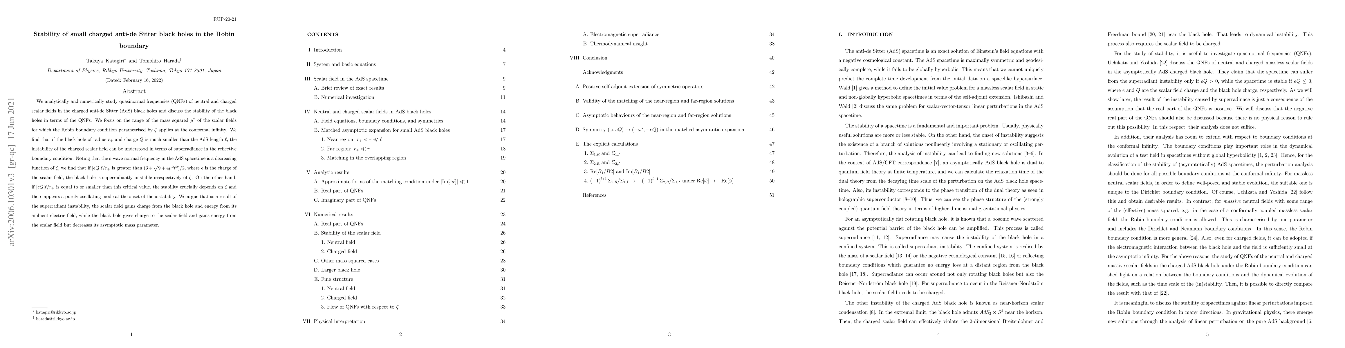 We analytically and numerically study quasinormal frequencies (QNFs) of neutral and charged scalar fields in the charged anti-de Sitter (AdS) black holes and discuss the stability of the black holes in terms of the QNFs. We focus on the range of the mass squared $\mu^2$ of the scalar fields for which the Robin boundary condition parametrised by $\zeta$ applies at the conformal infinity. We find that if the black hole of radius $r_{+}$ and charge $Q$ is much smaller than the AdS length $\ell$, the instability of the charged scalar field can be understood in terms of superradiance in the reflective boundary condition. Noting that the s-wave normal frequency in the AdS spacetime is a decreasing function of $\zeta$, we find that if $|eQ|\ell/r_{+}$ is greater than $(3+\sqrt{9+4\mu^2\ell^2})/2$, where $e$ is the charge of the scalar field, the black hole is superradiantly unstable irrespectively of $\zeta$. On the other hand, if $|eQ|\ell/r_{+}$ is equal to or smaller than this critical value, the stability crucially depends on $\zeta$ and there appears a purely oscillating mode at the onset of the instability. We argue that as a result of the superradiant instability, the scalar field gains charge from the black hole and energy from its ambient electric field, while the black hole gives charge to the scalar field and gains energy from the scalar field but decreases its asymptotic mass parameter.