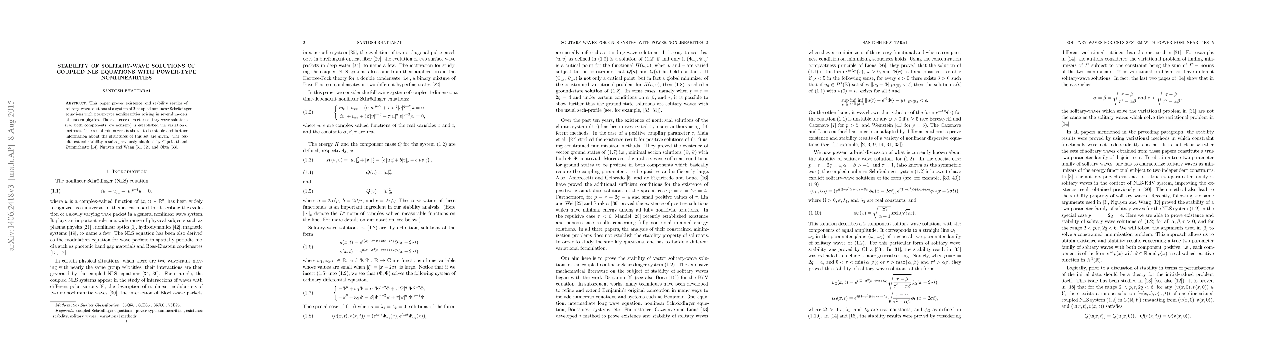 This paper proves the existence and stability of solitary-wave solutions to coupled nonlinear Schr"{o}dinger equations with power-type nonlinearities in various modern physics models.