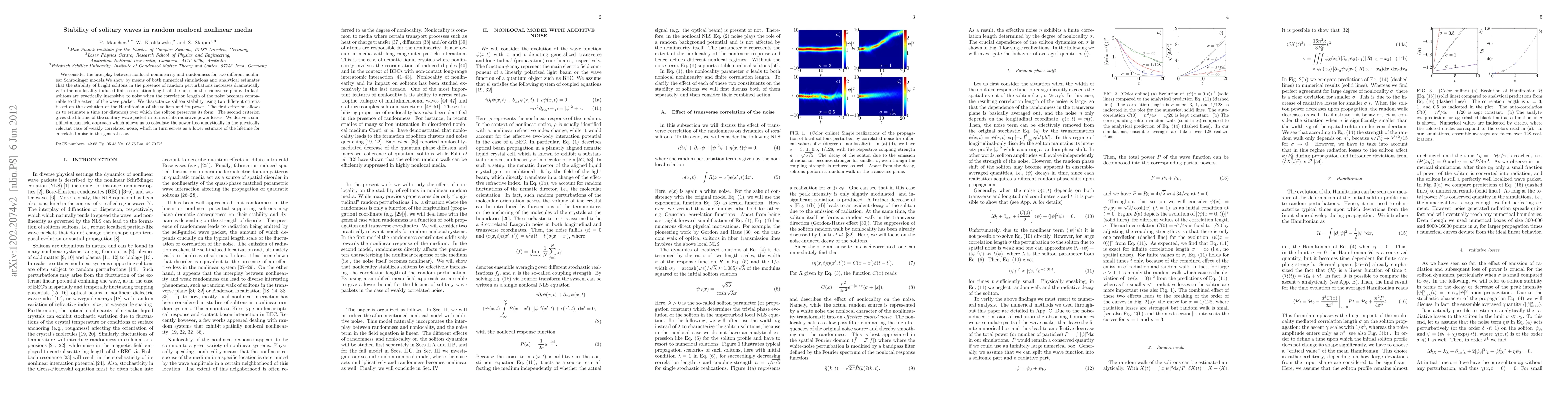 We consider the interplay between nonlocal nonlinearity and randomness for two different nonlinear Schr\"odinger models. We show that stability of bright solitons in presence of random perturbations increases dramatically with the nonlocality-induced finite correlation length of the noise in the transverse plane, by means of both numerical simulations and analytical estimates. In fact, solitons are practically insensitive to noise when the correlation length of the noise becomes comparable to the extent of the wave packet. We characterize soliton stability using two different criteria based on the evolution of the Hamiltonian of the soliton and its power. The first criterion allows us to estimate a time (or distance) over which the soliton preserves its form. The second criterion gives the life-time of the solitary wave packet in terms of its radiative power losses. We derive a simplified mean field approach which allows us to calculate the power loss analytically in the physically relevant case of weakly correlated noise, which in turn serves as a lower estimate of the life-time for correlated noise in general case.
